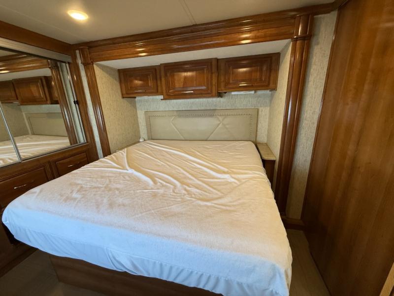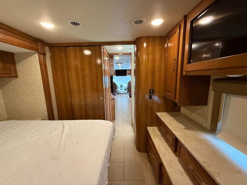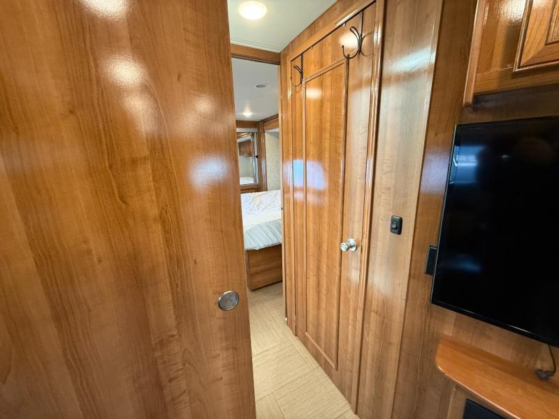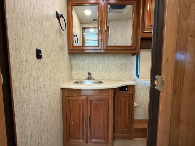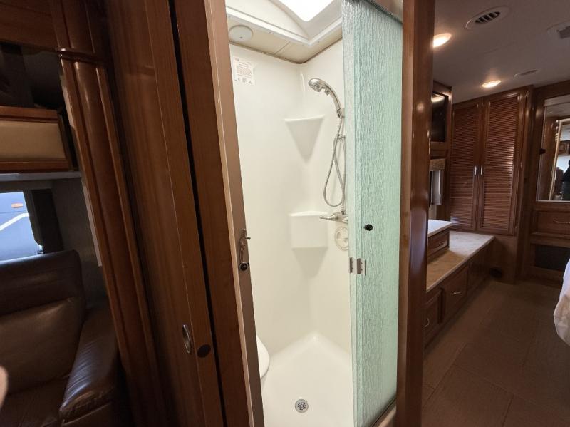 The bath is split and features a 38" x 30" shower on your left as you head toward the rear of the coach, and there is a private toilet and sink with overhead storage space on the right side.