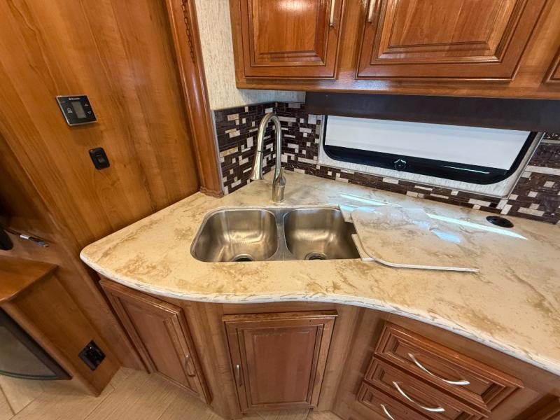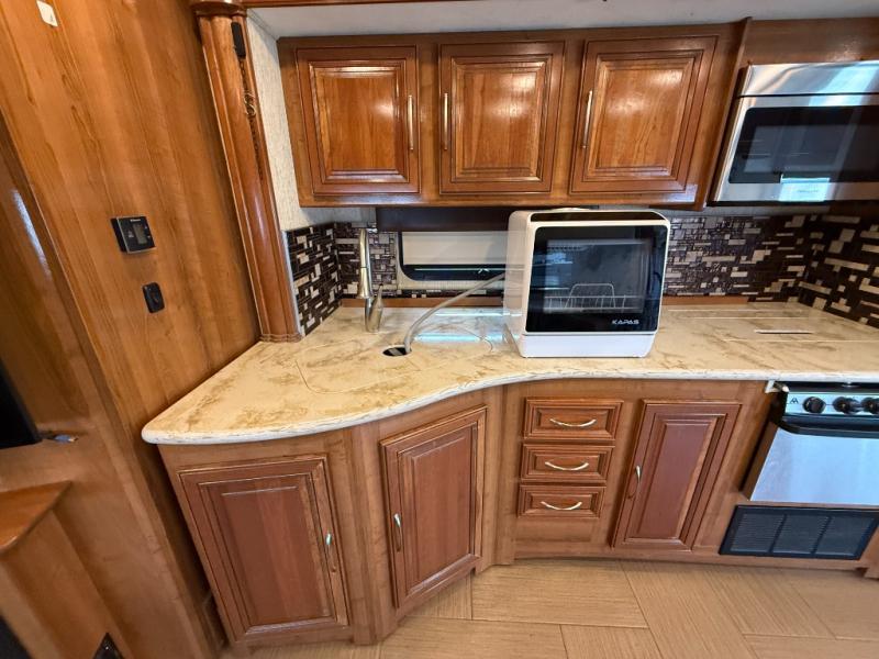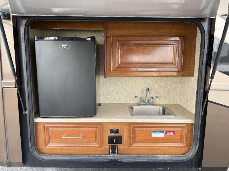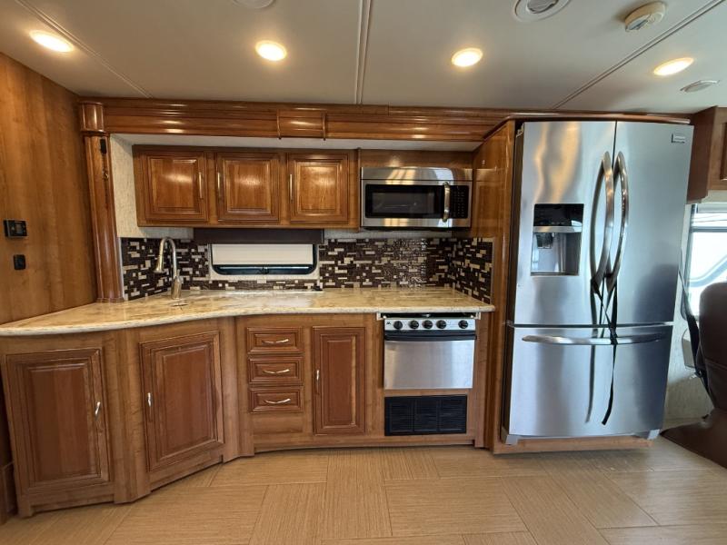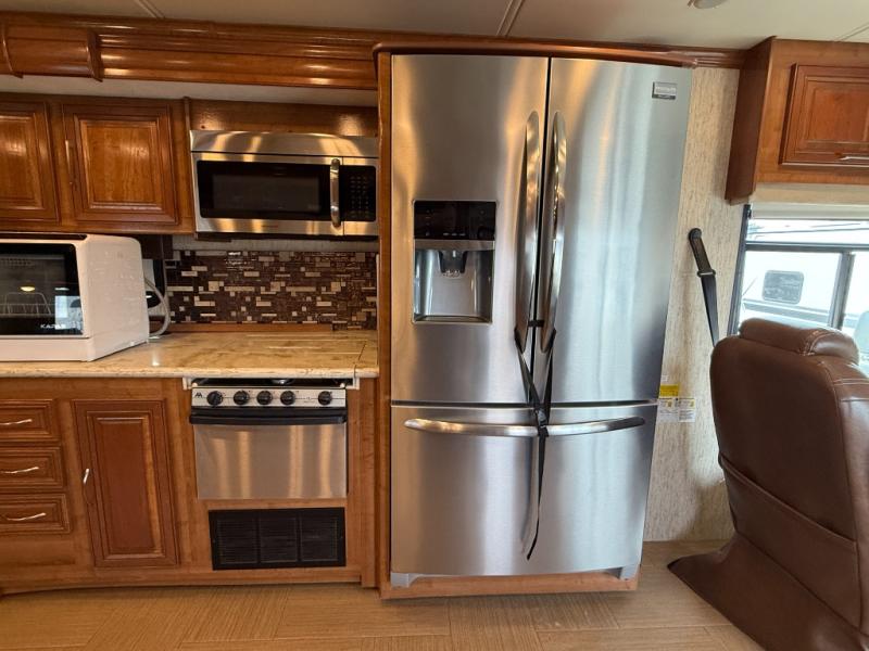 Opposite the door side, find a slide out kitchen including a residential stainless steel refrigerator, a three burner range, an overhead convection microwave oven, and a double sink angled the same as the entertainment center. There is also plenty of overhead storage, plus counter space for food prep as well.