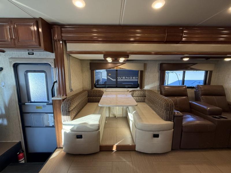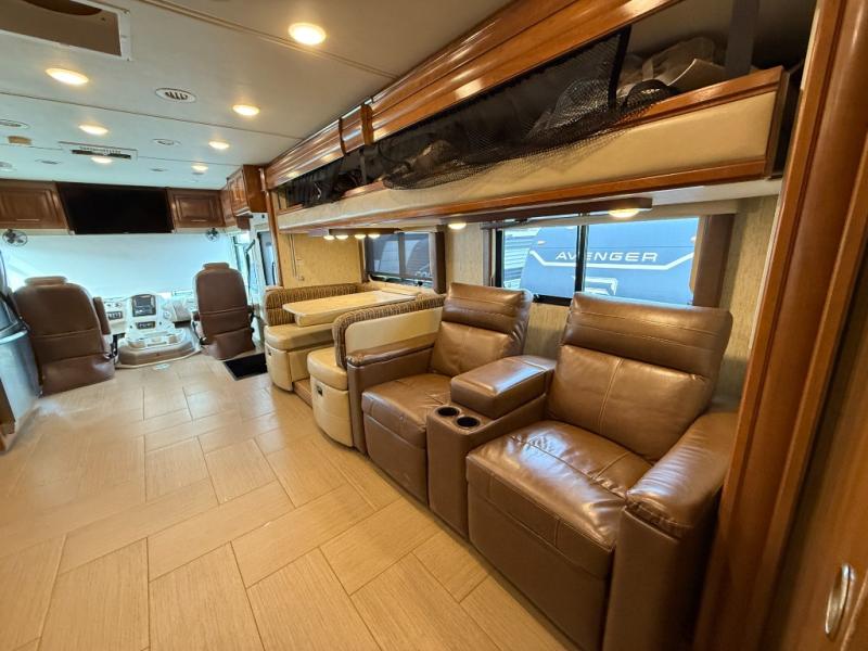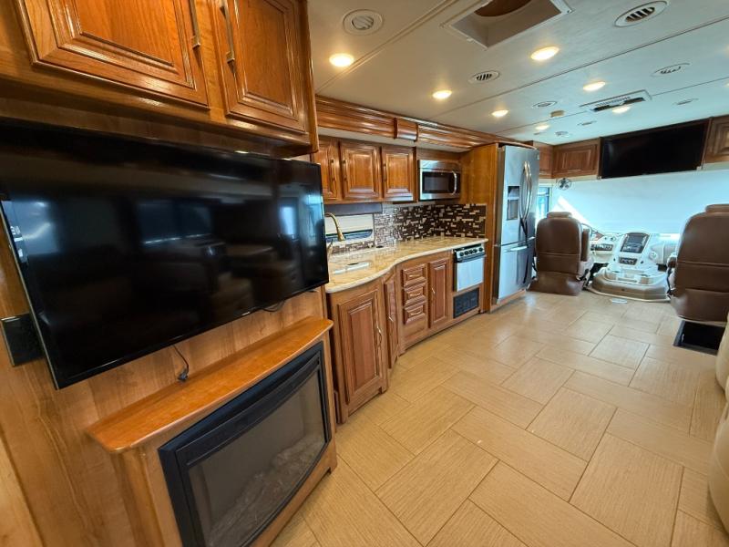 As you step inside, just behind the front passenger seat, you will feel the spaciousness thanks to dual opposing slides in front. There is a slide out 40" x 70" dinette and 70" sofa bed with footrests to the left of the door. The sofa features overhead storage, plus you can choose optional theater seating if you like instead. Opposite the sofa enjoy a 43" LED TV and fireplace along the angled outer bathroom wall which makes it perfectly viewable from any seating in the space.