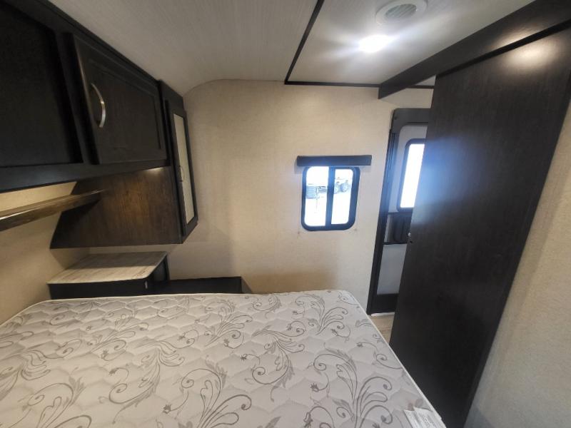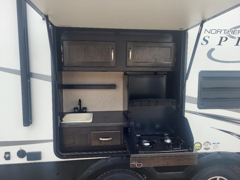 Coachmen RV has done it again with the Northern Spirit Ultra Lite travel trailers. You have a ton of cool features that include the pet center and the kid's convenient centers for those rain days (includes a basket for their phones, a USB port, and a reading light.) Some models have outdoor camp kitchens with bottle openers, and there is storage everywhere you look whether you are outside or inside. Inside you have dark walnut cabinetry with light colored countertops, walls, and flooring giving you a nice contrast and a beautiful at home feel. A couple of other impressive features are easy to touch lights above the sofa, a hanger closet with a vertical hanging bar, and the motion activated lights so when you have to go to the bathroom at night you won't be in the complete dark.