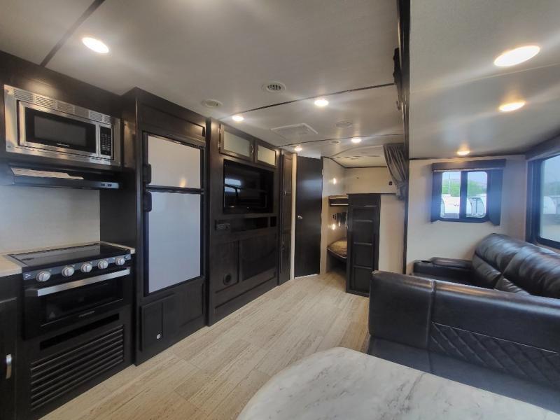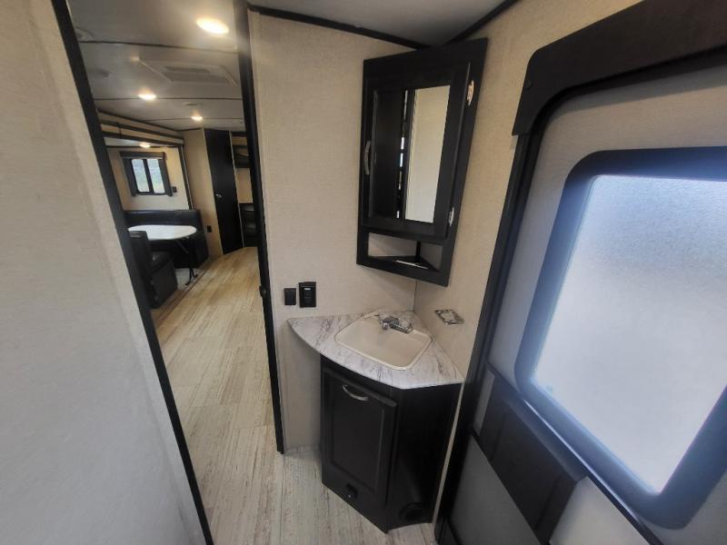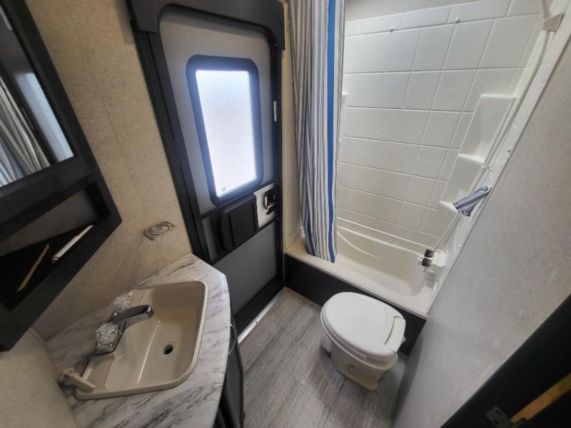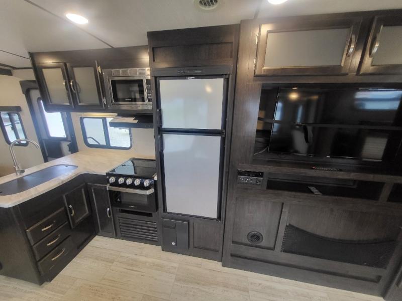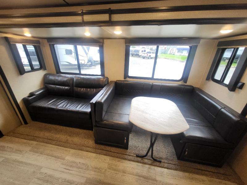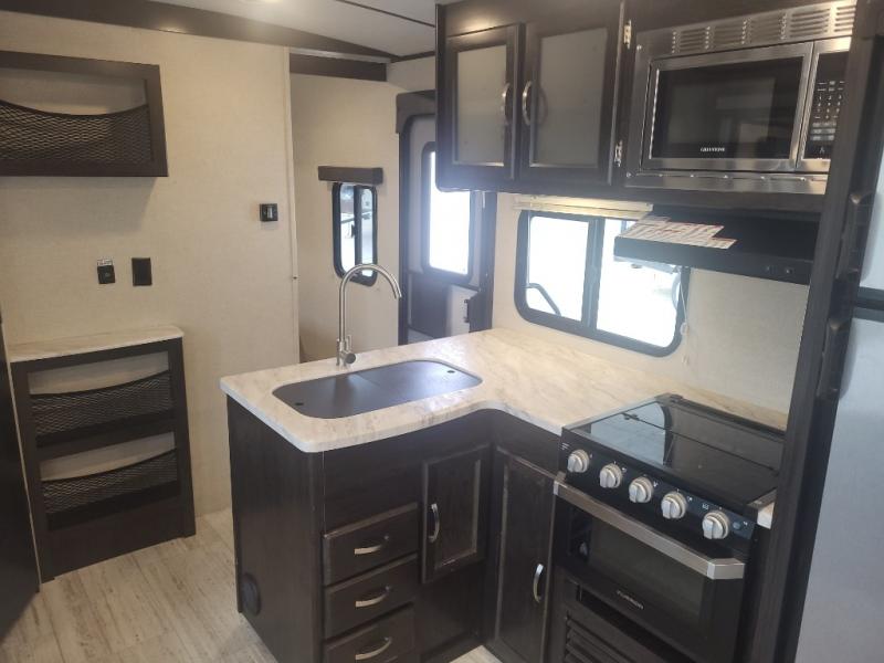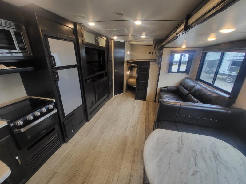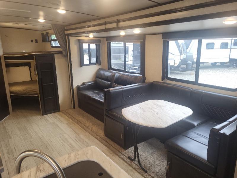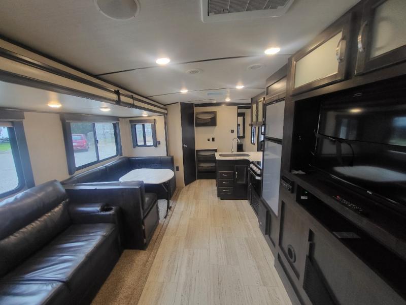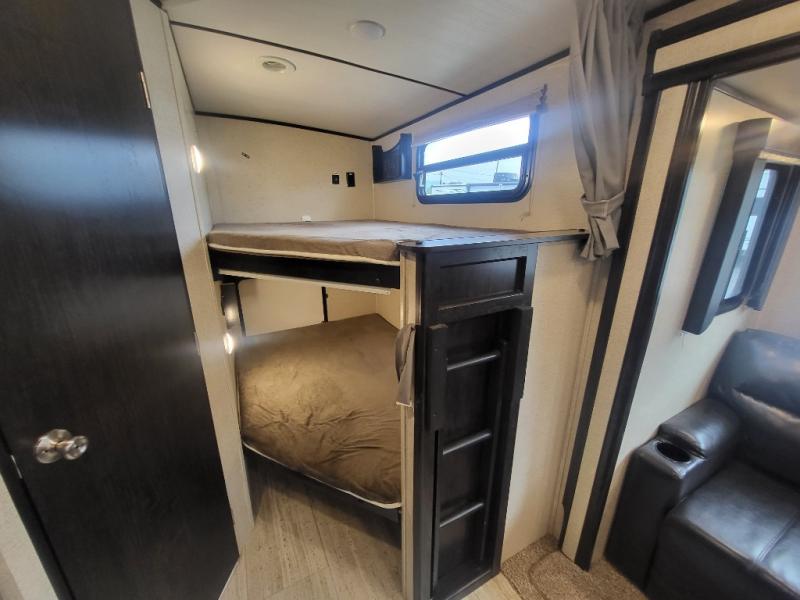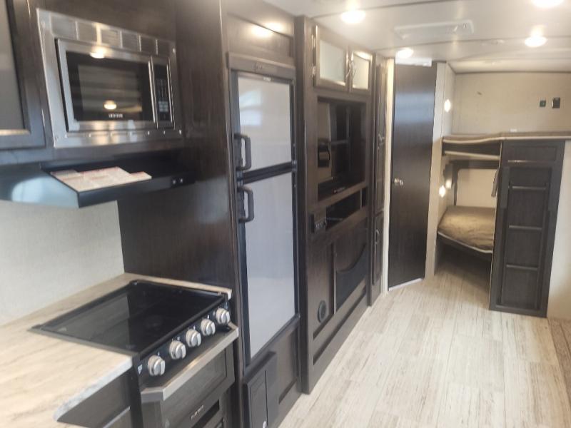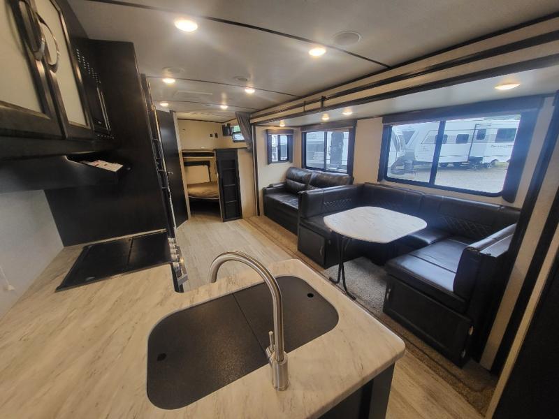 Being one of the larger units in this series, you can be sure you will have ample space while you are traveling and while you are camping. The large slide out not only gives you added walking around area, but the u-shaped dinette and sofa can also fold down into sleeping space at night if needed. Fold up the bunks in the back for added storage space so that you can bring the bikes or folding chairs and table. The dual entry and exit doors also help with convenience as one of them leads straight into the bathroom, so you don't have to walk through the unit throughout the day. Check out model 2963BH today!