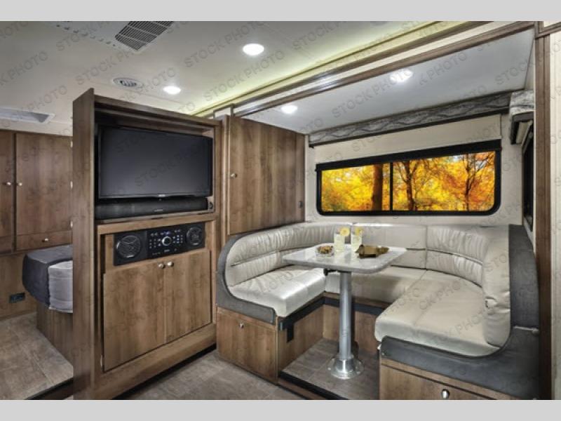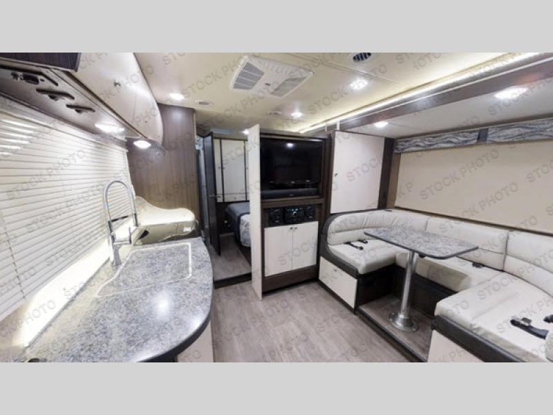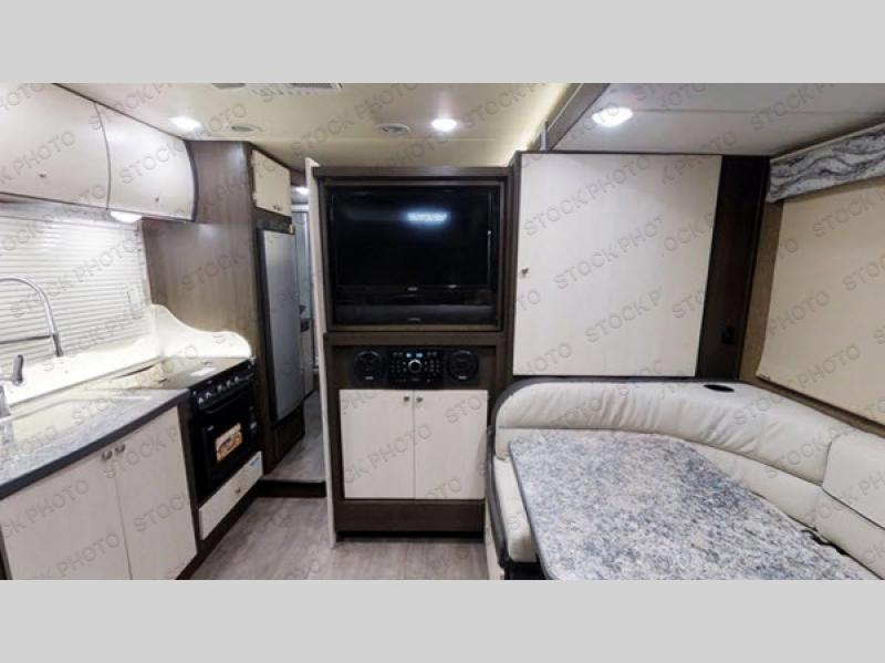 Do you dream about traveling to far destinations and enjoy attending events with the comforts of your own bathroom and bedding? This Prism Elite 24EF class C diesel motor home makes traveling and sleeping comfortable for all. In the morning you can enjoy your coffee while sitting in the driver and passenger seat with a pedestal table between. You can rest on the queen bed while the kids or your guests sleep on the cab-over bunk or U-shaped dinette once prepared for bedtime. You will appreciate the convenience of a private bathroom no matter where you travel. And the cook will surely love heating up leftovers in the convection microwave for quick meals when on the go. Come see why this RV just makes sense!