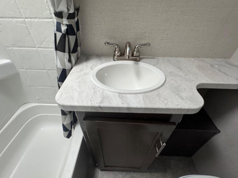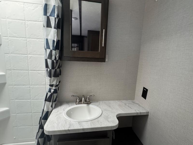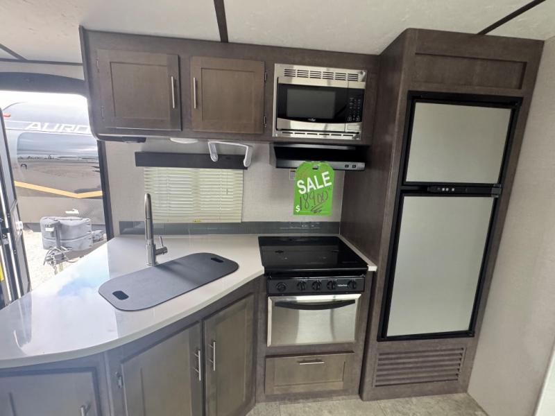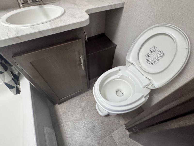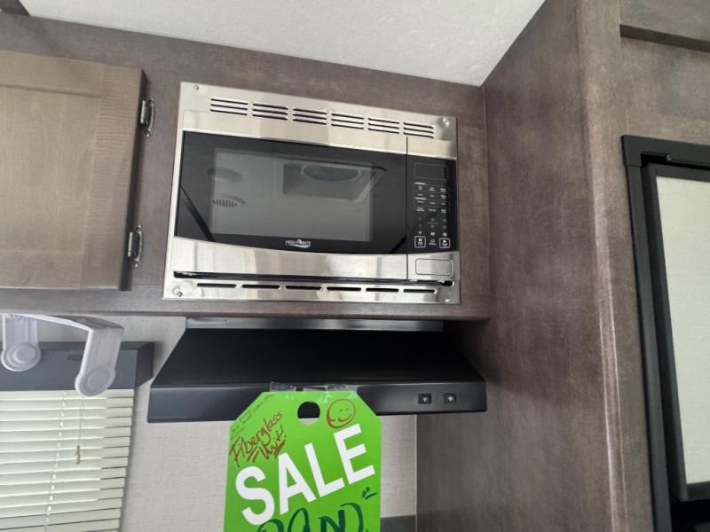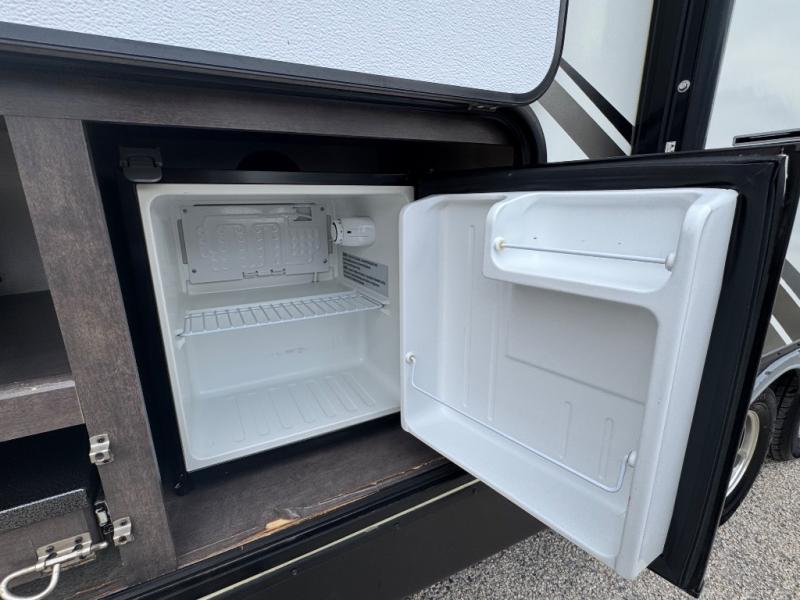 The exterior of this CrossRoads travel trailer is completely sleek and modern looking with its tinted windows that help protect your interior decor from fading and its painted fiberglass front cap that curves over to the roof giving this model a more aerodynamic approach. However, you will enjoy spending your evenings outside of this trailer for more reasons than just the appealing exterior vibe because this model comes equipped with an electric awning with LED lights, as well as outdoor speakers which make this area the perfect place to host a late-night get together with friends.