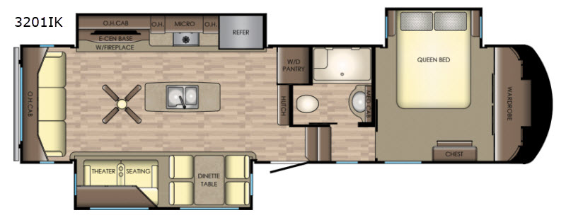 You are sure to enjoy any camping adventure when you choose to camp with this triple slide out Volante 3201IK fifth wheel. In the kitchen and living area there is plenty of room to do a little entertaining. Here you can whip up a few snacks or favorite meals for your crew in the spacious kitchen which features residential refrigerator, plus large island with a double sink. You can still be included in the conversations among your friends who are in the living area sitting at the sofa or the theater seats. At night head up to your quiet retreat in the private front bedroom where you will find a queen bed plus a full wall wardrobe for all of your clothes and more!
