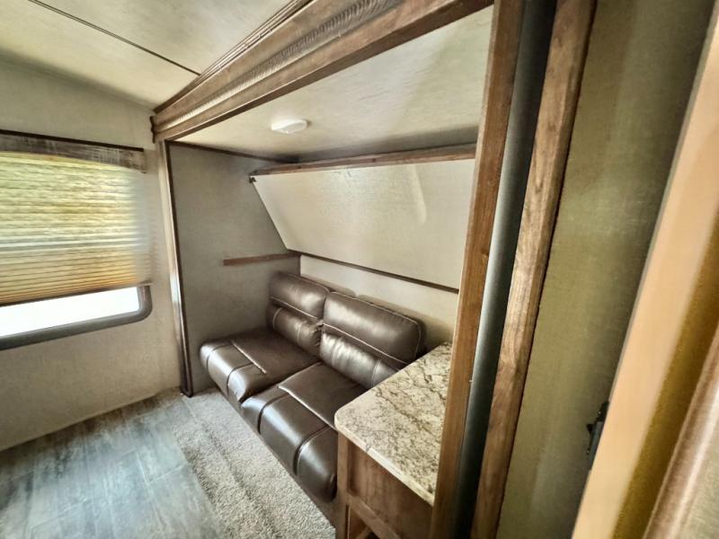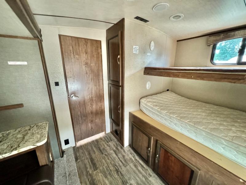 If you have been imagining traveling with your larger family with plenty of space for everyone once at your destination, this Radiance Ultra Lite 33TS might be the one! From having your own bedroom while the kids have their own private bunkhouse with triple bunks and a futon, to being about to cook inside or outside, this model has a favorite spot for each of you. The chef will enjoy preparing the food on the kitchen island while visiting with the kid that decided to stay inside. The outdoors person will love playing around the campground, exploring in the forest, cooking on the outside kitchen, and relaxing by the campfire. So if you enjoy the great outdoors, need lots of space to sleep, and don't want to stay in a hotel, check this model out.