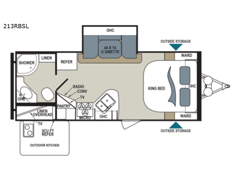 This Dutchmen Aerolite Luxury Class 213RBSL travel trailer features a king size bed, single u-shaped dinette slide for extra living space, an outdoor kitchen and TV, plus more!