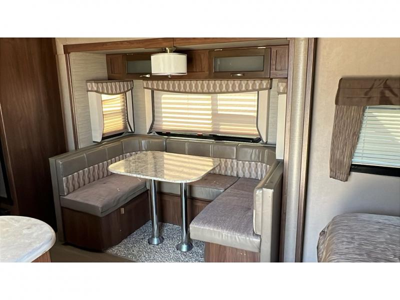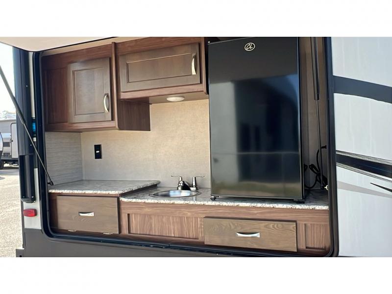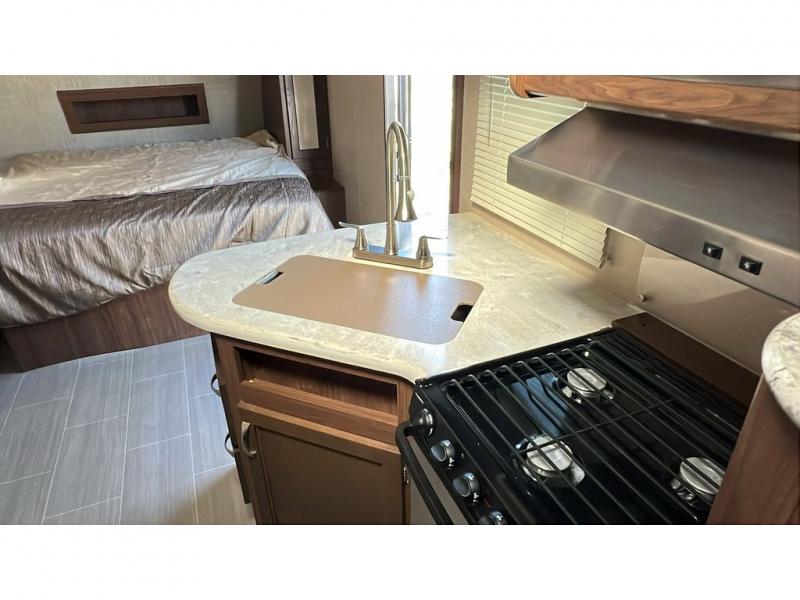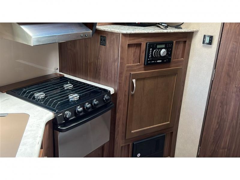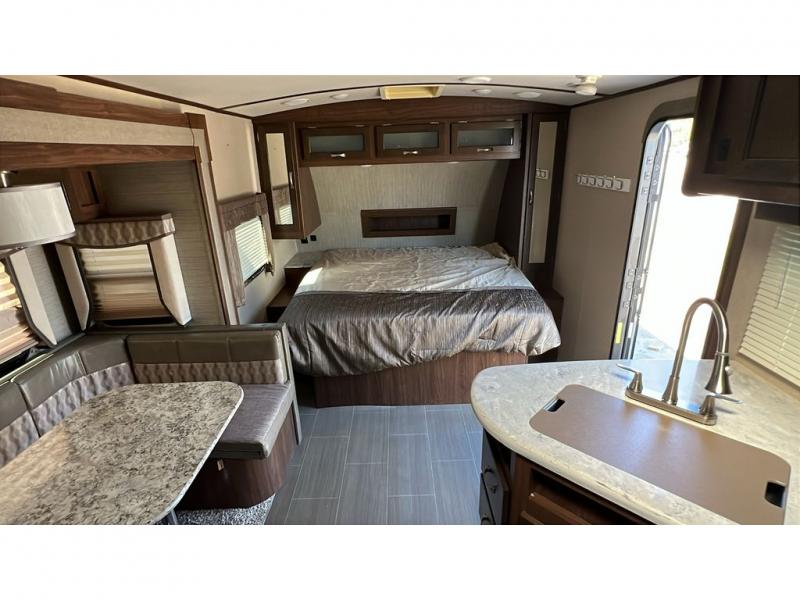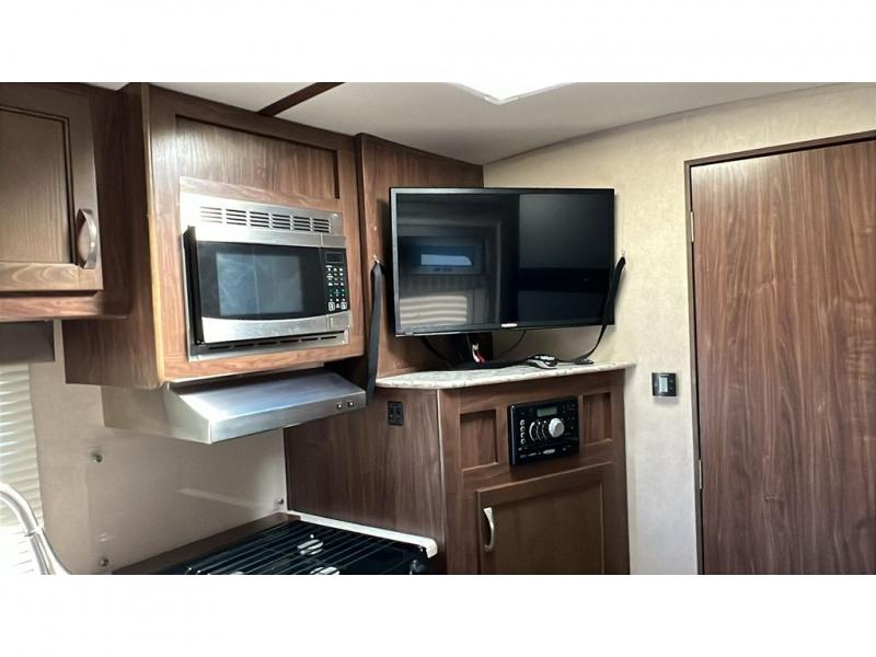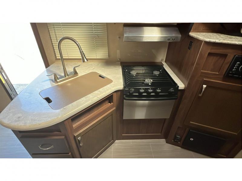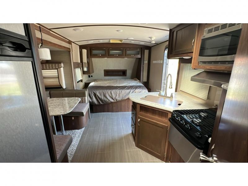 The 44" x 74" u-shaped dinette with overhead storage is in the trailer's slide out with a large refrigerator beside it. On the opposite wall, you will find the kitchen area that features an angled double sink, and a three burner range with overhead microwave and cabinets. A corner pantry area with a TV mount above allows plenty of space for dry goods and inside time with the optional TV.