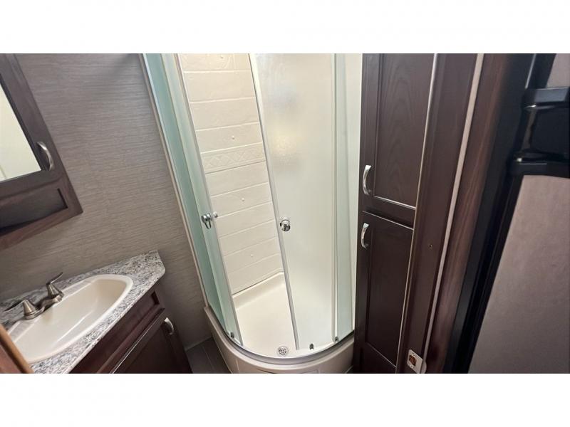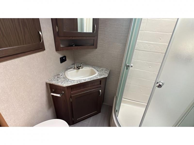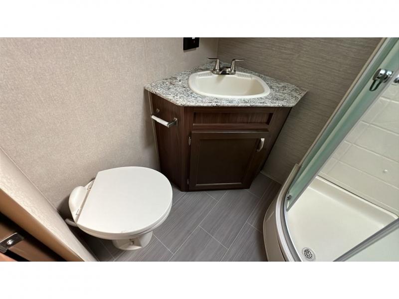 A rear bathroom highlights a radius shower, a corner toilet, a vanity sink with medicine cabinet above, and an overhead linen storage.