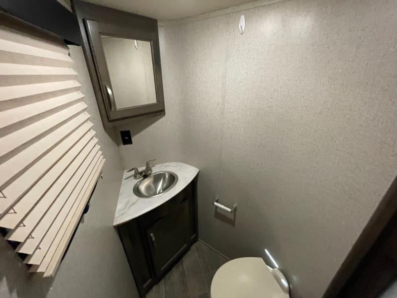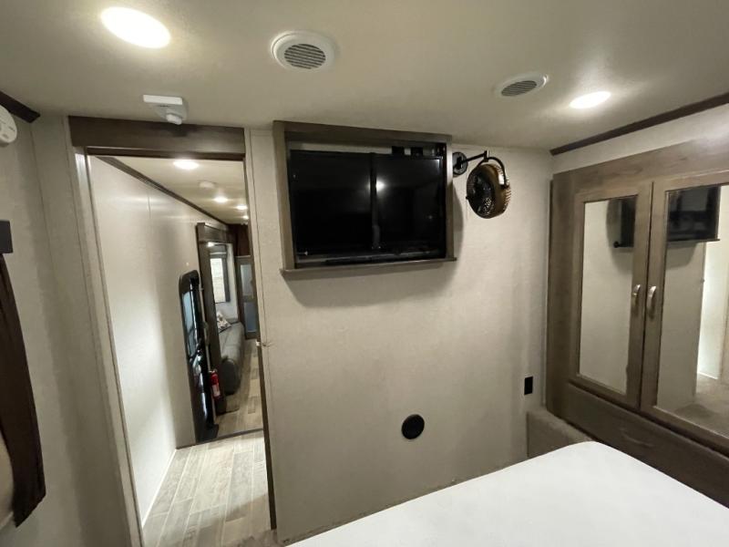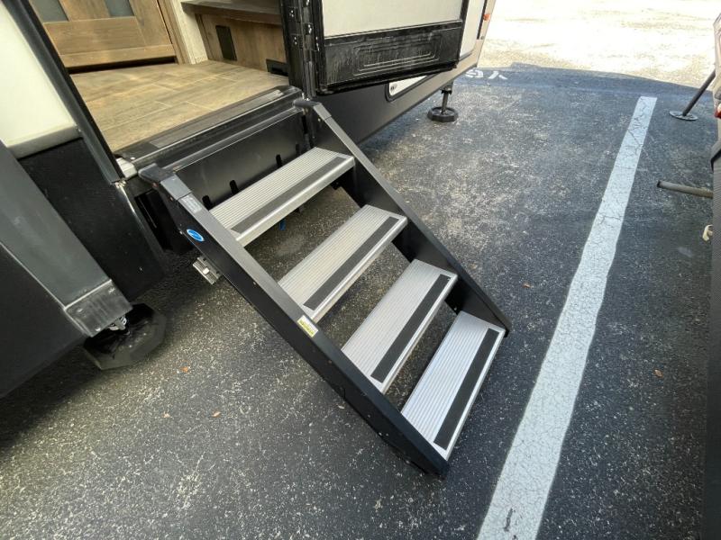 The 11-foot garage is where this toy hauler truly shines. Whether you’re hauling motorcycles, ATVs, or other gear, you’ll appreciate the durable flooring, tie-down system, and easy-loading ramp door. A built-in 30-gallon fuel station keeps your adventures going without interruption, while the versatile garage space can also convert into additional living or sleeping areas when needed.