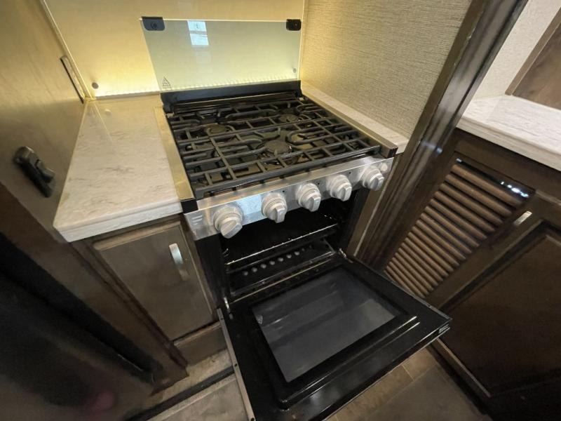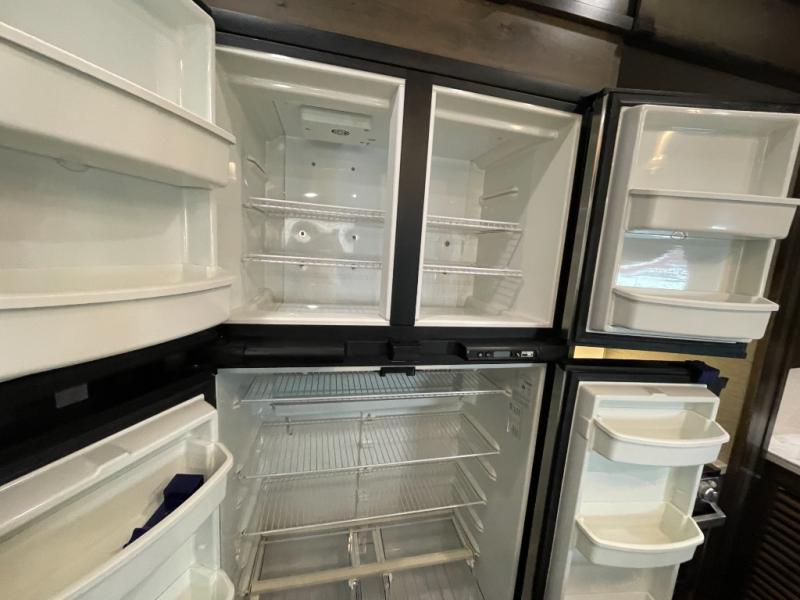 Step inside and you’ll immediately notice the residential-style interior, complete with solid surface countertops, stainless steel appliances, a convection microwave, and a full-size oven—making it easy to cook just like you would at home. Comfortable seating, including upgraded furniture with LED lighting, heat, and massage features, creates a true luxury lounge experience on the road.