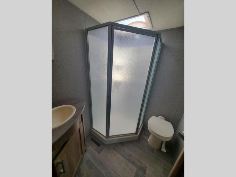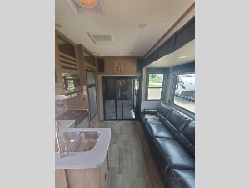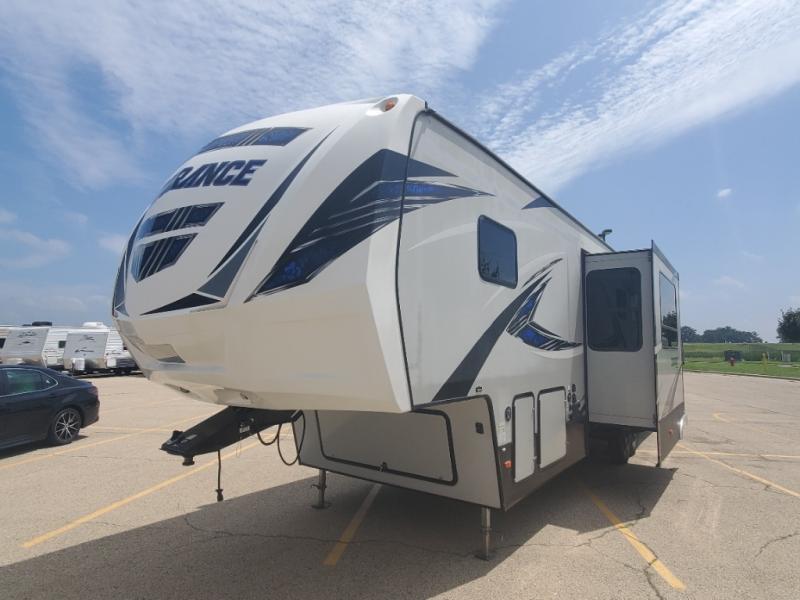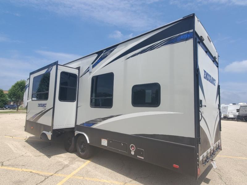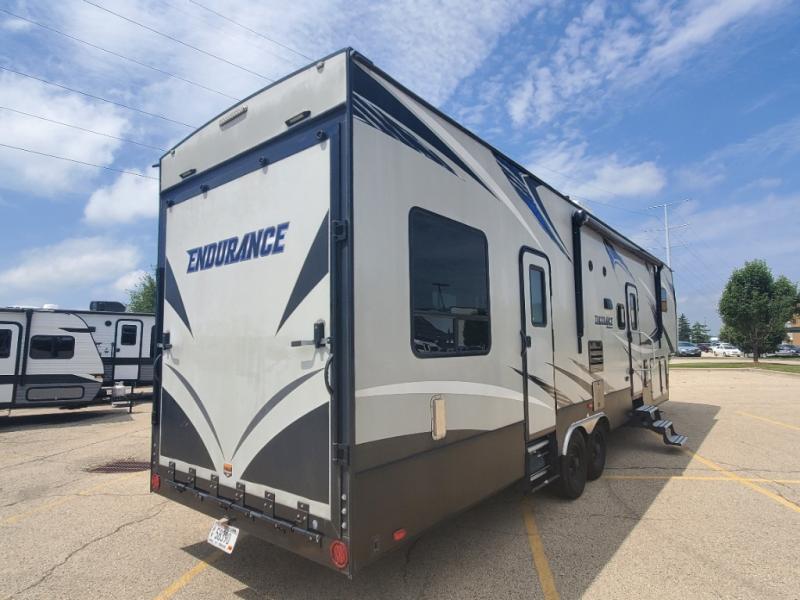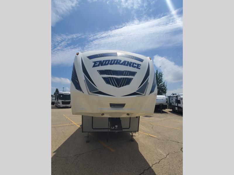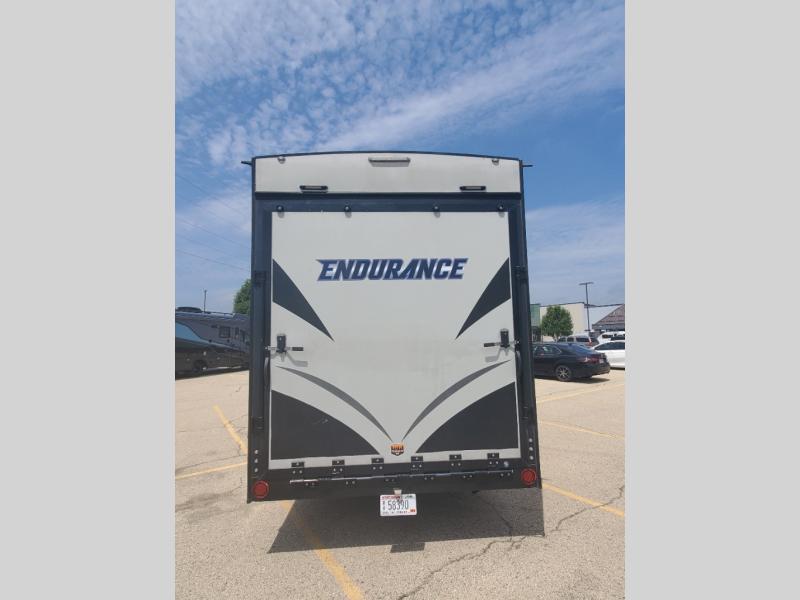 It's time to take some time off work and enjoy the great outdoors with your family and off-road toys in this Endurance 3456 toy hauler fifth wheel. Imagine sleeping in the front bedroom while the kids sneak out the side man door or rear ramp door with the ATVs in the morning. You can sleep in or relax on the residential furniture while watching the LED TV. The bathroom includes a fiberglass shower for easy clean up after a fun weekend away. The cook in the family will enjoy the stainless steel appliances and solid surface countertops when making meals to refuel the gang for another adventure outside. Everyone can keep their electronics powered up with the charging locker, and enjoy the great outdoors while inside with the pull down screen in the garage area and the glass patio doors open. You will find plenty of sleeping space for everyone, plus much more!
