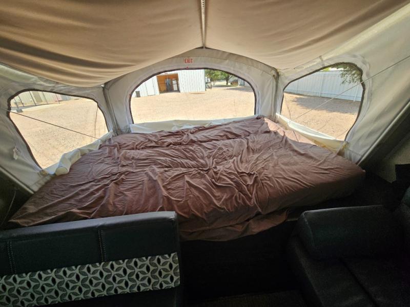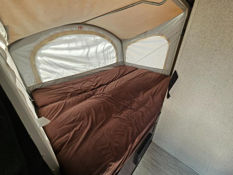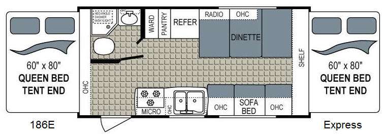 The front and rear provide queen tent end beds for sleeping. The front tent has an overhead shelf available as you enter the bunk. The rear tent end bunk features an overhead cabinet the entire width of the unit, plus so much more!
