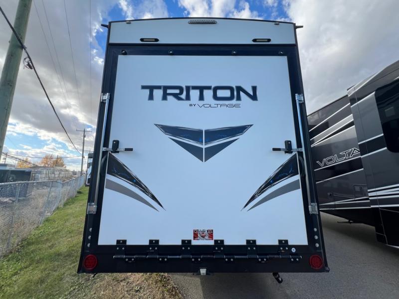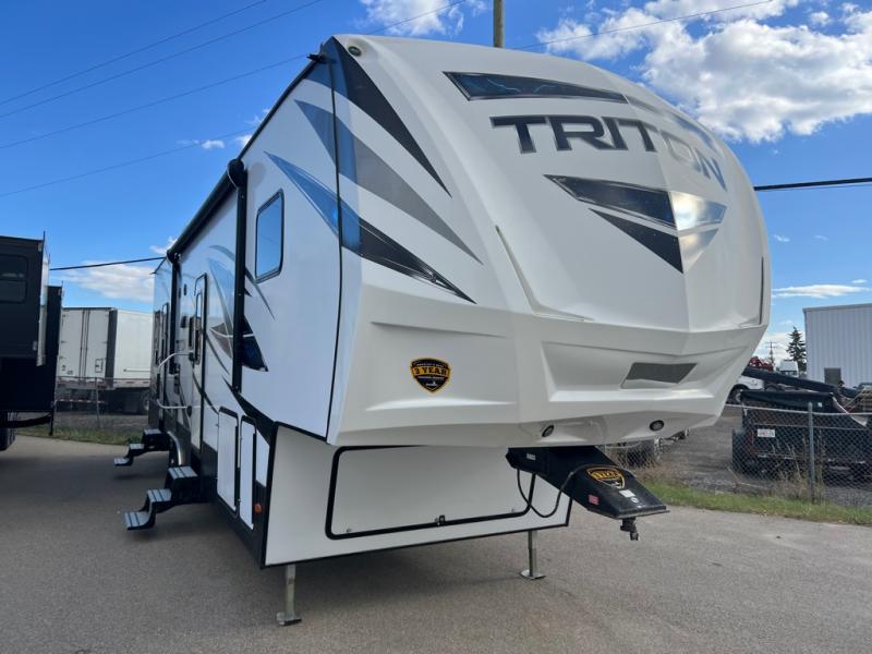 The fun doesn't stop when you decide to take a break in this Triton fifth wheel toy hauler model 3561. Your toys or kids will have their very own 13' separate garage and living area, while you can enjoy the main living/kitchen combined space or sleep soundly in the master bedroom. There is a rear Happi-Jack power bunk above two fold-up sofas with a table beneath, and a side man door in the garage. You will be able to close off this space with the glass patio doors between these two areas to watch TV or eat dinner. The cook in the family will enjoy all the kitchen amenities, and everyone will appreciate being able to get cleaned up in the full bathroom. You might even decide to choose the ramp door patio system option. So if you need toy space or a second living area, choose this Triton!