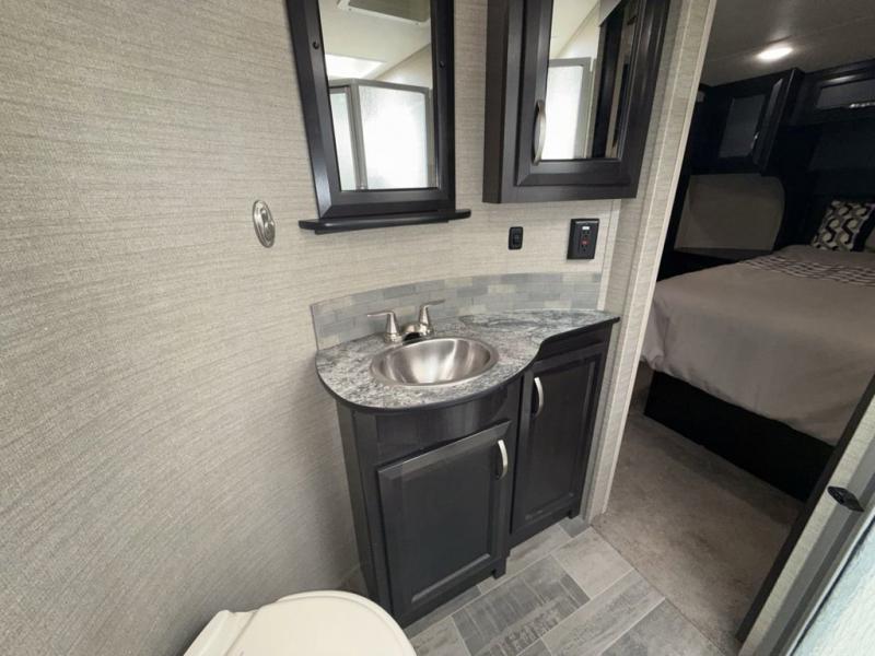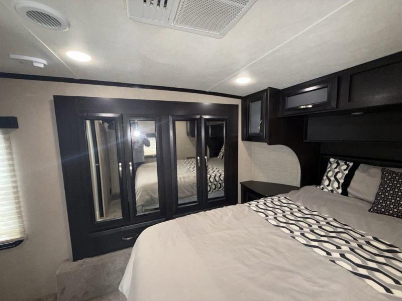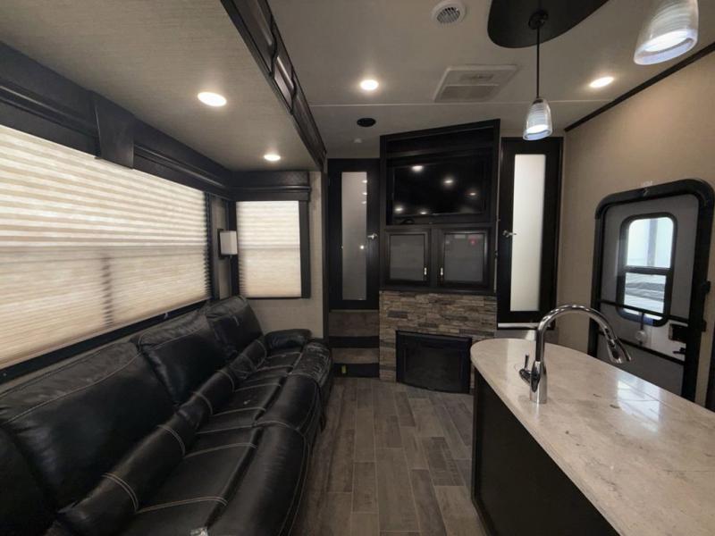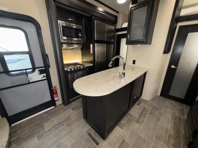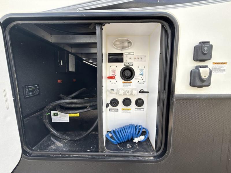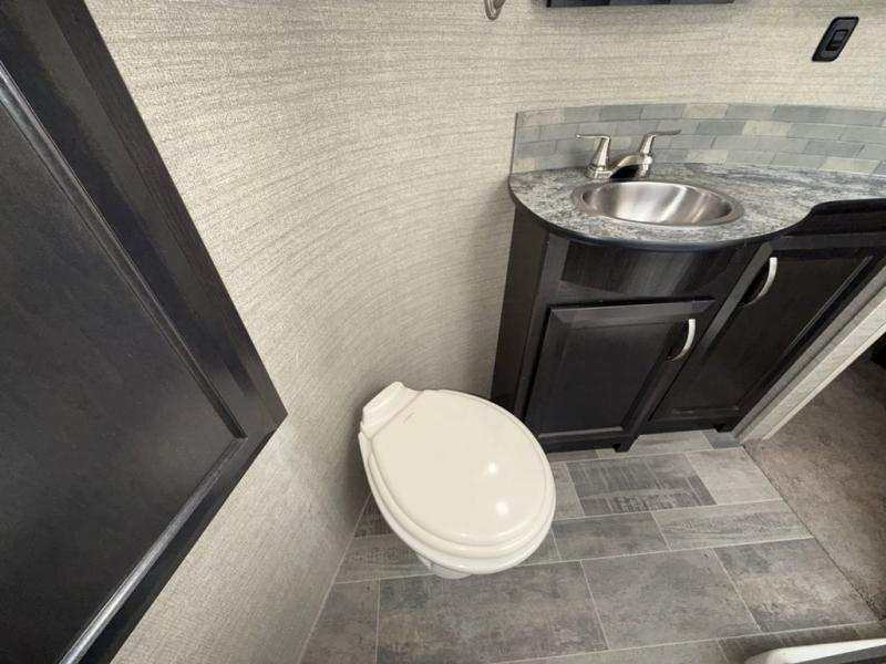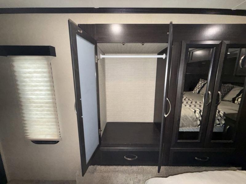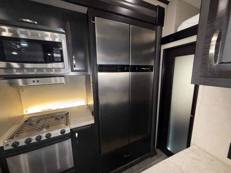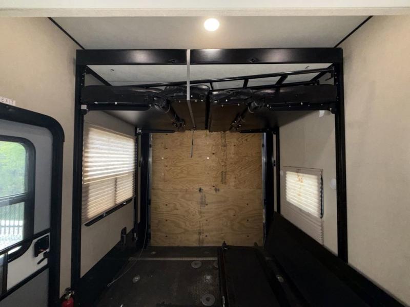 You will have everything you need to enjoy any camping adventure with this Voltage FW toy hauler. Dual entry from the outside makes loading and unloading super easy, and there are two entry doors into the living space from the garage. Dual entry into the bathroom is also another plus that you will find when inside that allows access from the living area as well as from the master bedroom up front. The private front bedroom even features his and her dual wardrobes. From generous storage throughout, to the at-home features and comforts for you and your guests, this Voltage toy hauler is a great way to travel even if you don't take along added toys!