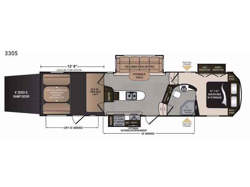 Even though the Voltage is the most popular toy hauler in its class, you don't have to own toys to want or own any one of these units. These haulers are so versatile that just having the added garage space allows you so many more camping options. The extra space alone makes traveling so much more fun! Just think of how much gear you can take along for your favorite activities and outdoor games. Each rear ramp can be positioned horizontally to allow you to add optional awnings, screen rooms, and side rails to create a rear patio, or even a set of steps to the ground. Now, how is that for camping when you can take your very own outdoor patio along! On the inside, you will find that Voltage offers higher ceilings for a spacious open feel, upgraded residential furnishings, a gourmet kitchen with quartz countertops, and hardwood cabinetry as well. And, with the 30 gallon gasoline fuel station standard on every model you can be assured that you can indeed keep all of the toys going for the weekend and beyond! So, for camping that requires your favorite outdoor toys, or even a backyard patio, choose any Dutchmen Voltage FW toy hauler and begin planning your next family adventure!