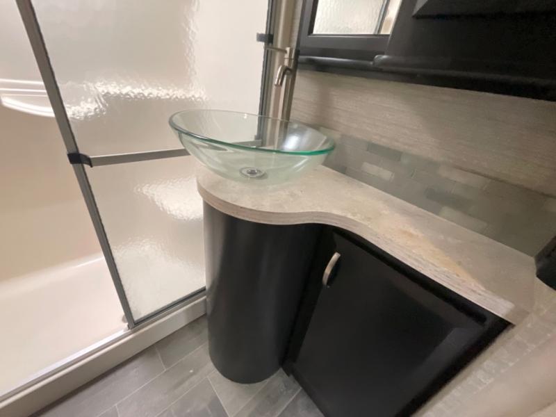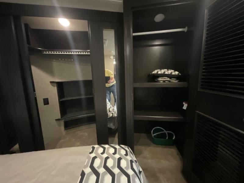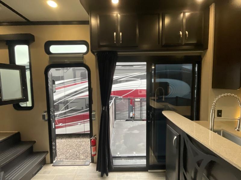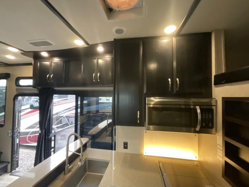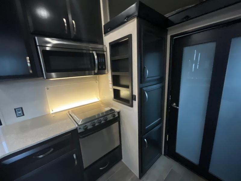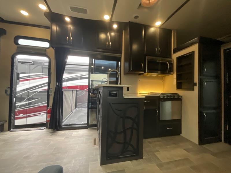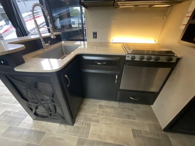 The main curb side entry door takes you into this comfortable Voltage unit as well. There are dual slide outs in the main living and kitchen area combined. The slide to your immediate left inside the door features a table with two bar stools, a 39" TV with fireplace below, and a refrigerator. The rest of the kitchen area is across from this slide, and provides a counter bar top with two more stools, a double sink, a three burner range with overhead microwave, and storage. You will easily be able to cook up food for the whole gang here!