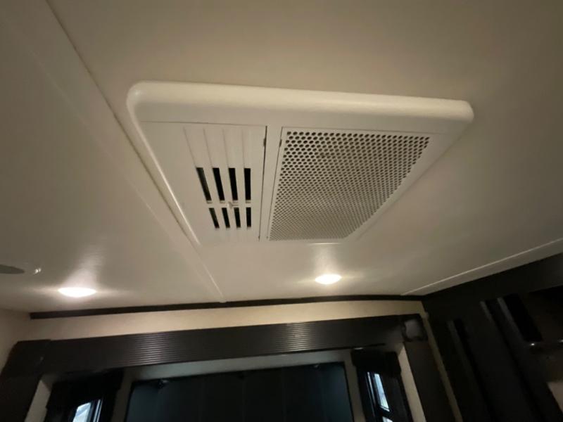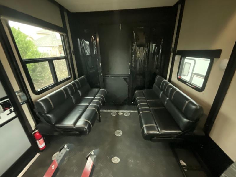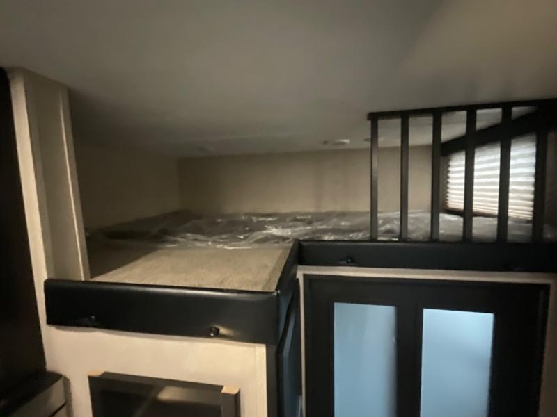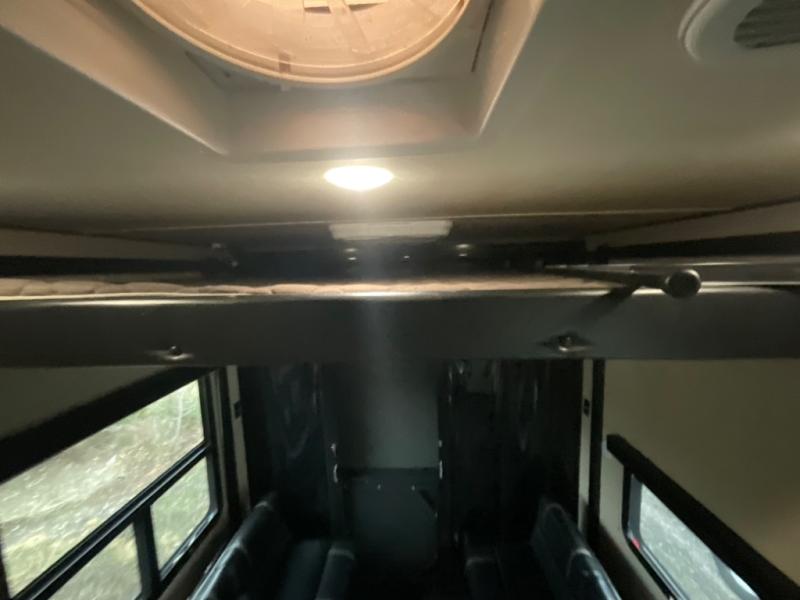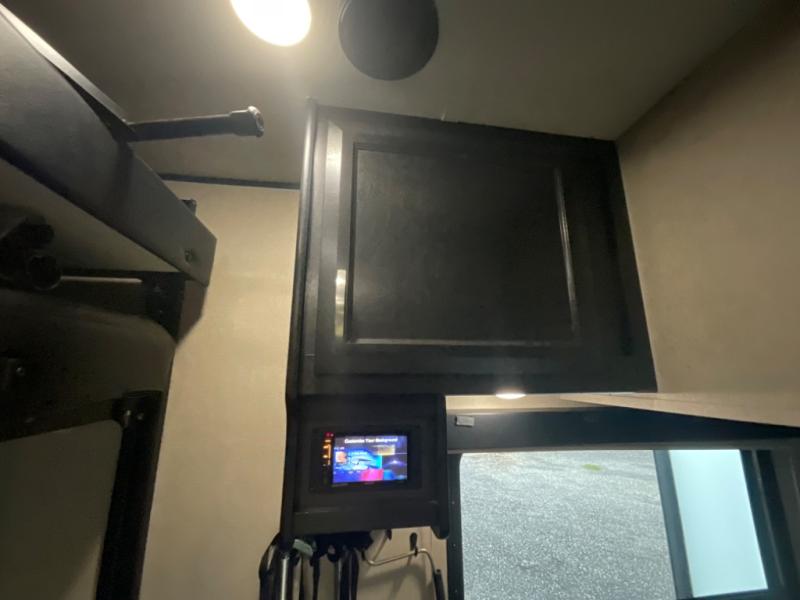 Inside once you reach your destination you will find a great space to hang out, and extra sleeping at night in the overhead twin loft. Or, the lay flat Happy-jack power bunk with sofas and a table top below provide more seating and sleeping space. You will also find a TV and storage toward the front beneath the loft space, and glass patio doors leading into the main living area.