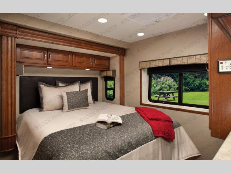 In the rear bedroom find a slide out with a king bed, and overhead cabinet. Across from the bed there are two wardrobes and a TV.