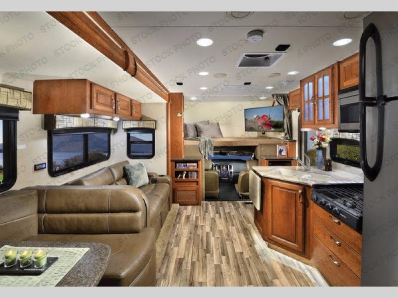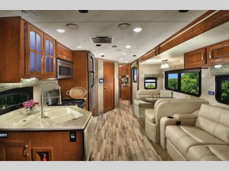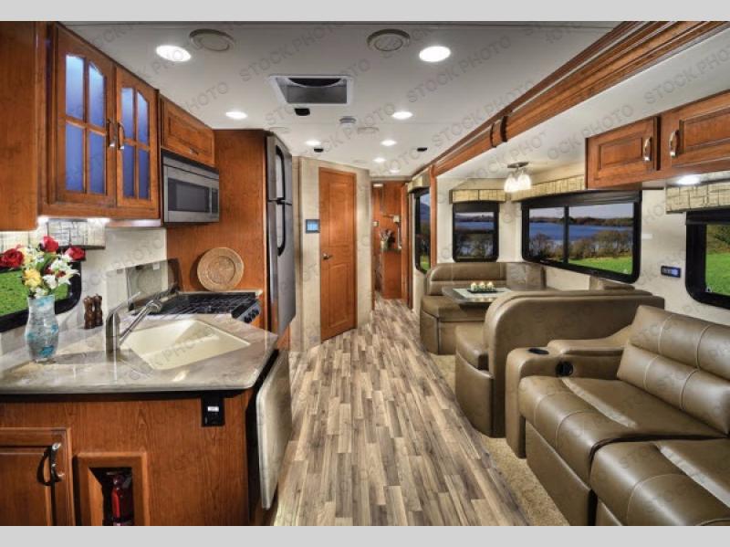 As you enter the motor home prepare to be wowed by the space and beauty! Along the curbside there is a counter extension, double kitchen sink, three burner range, refrigerator, and a pantry. On the opposite side of the motor home find a slide out with a sofa which makes into a bed, a dinette, and an overhead cabinet.