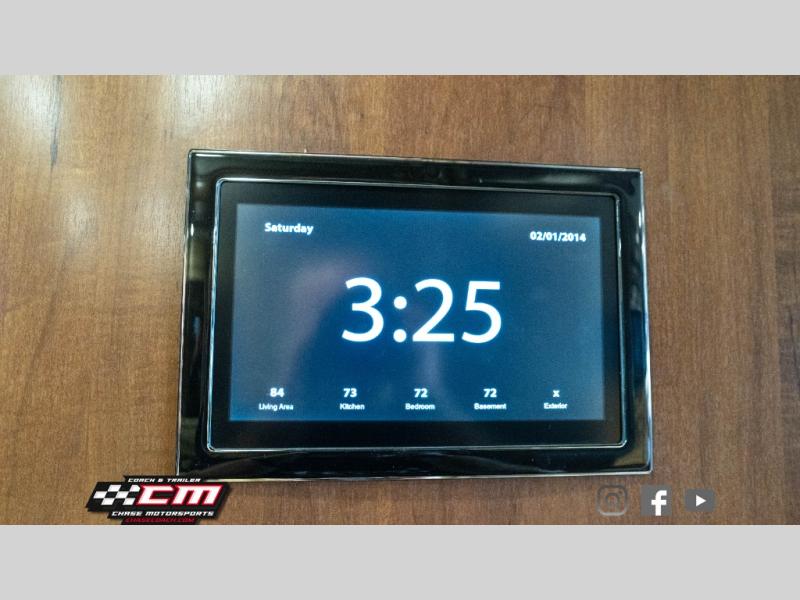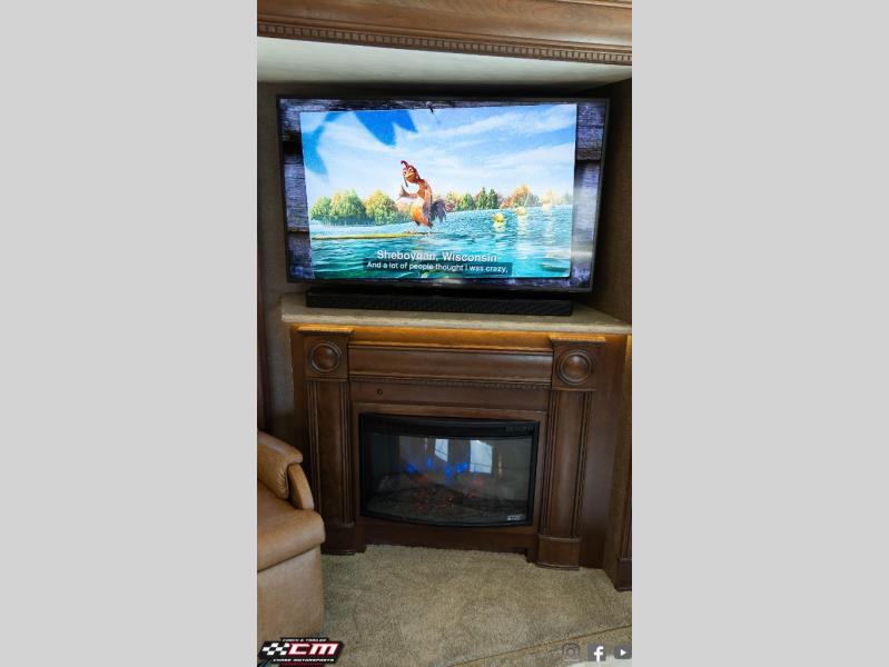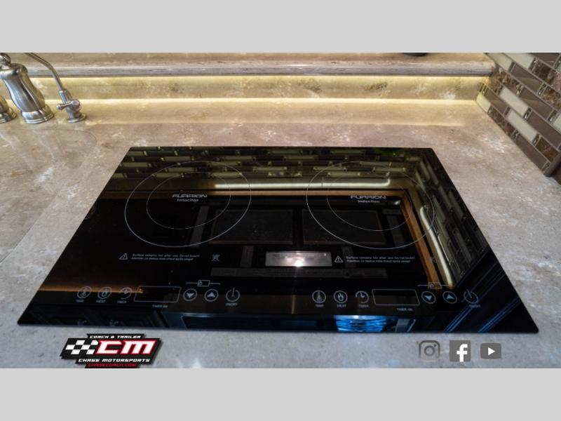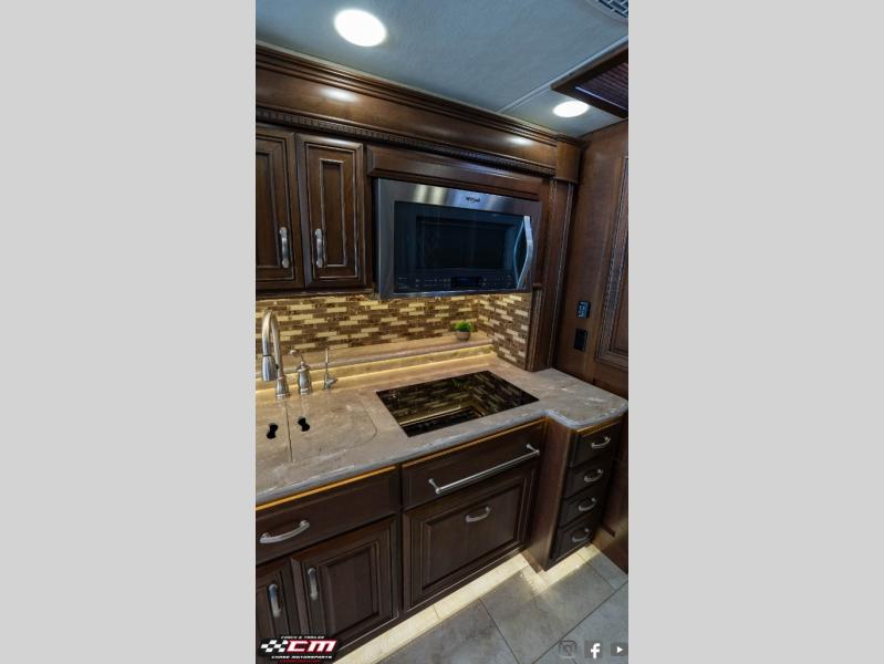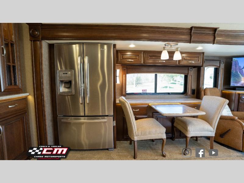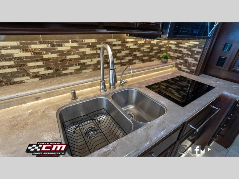 Along the passenger side of the motor home you will find a slide featuring a L-sofa with ottomans or you can choose the theater seat option with three power recliners. Continuing within in the slide you will find a double kitchen sink, two burner range, overhead cabinets, and a microwave. Next to the slide you can store your dry goods in the pantry. On the opposite side the second slide includes an entertainment center, fireplace and 50" TV. Continuing within the slide there is a dinette with chairs, and a refrigerator. You can choose a booth dinette instead of the free standing dinette if you like. Next to the slide you will find a nice size hutch to store more items.