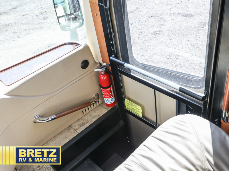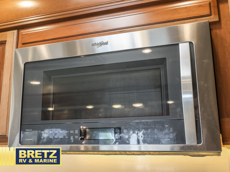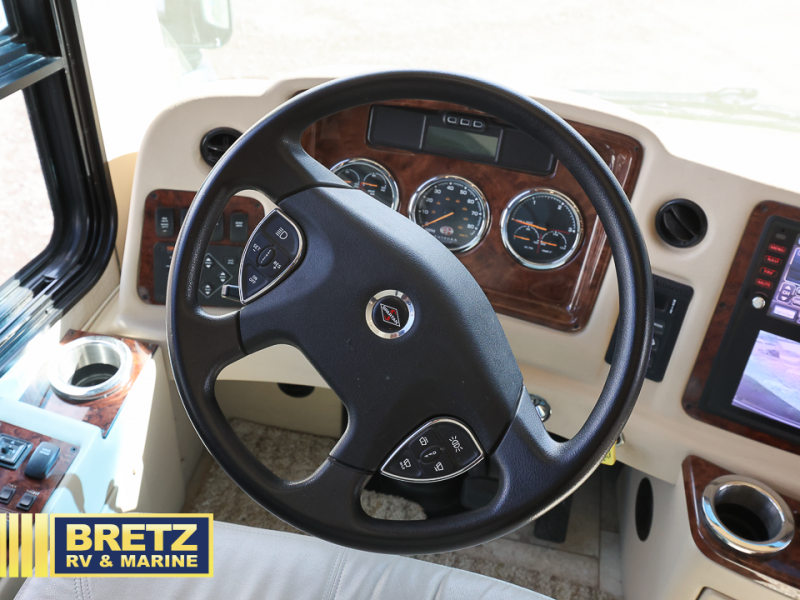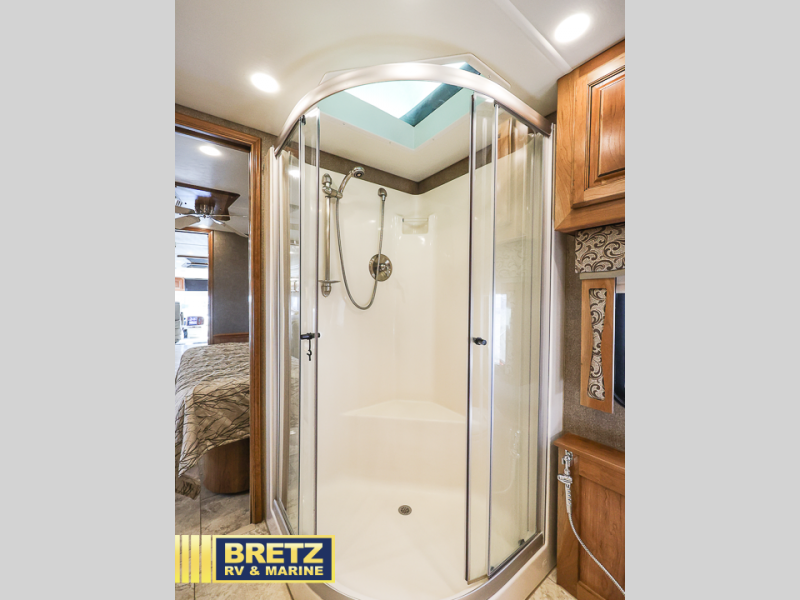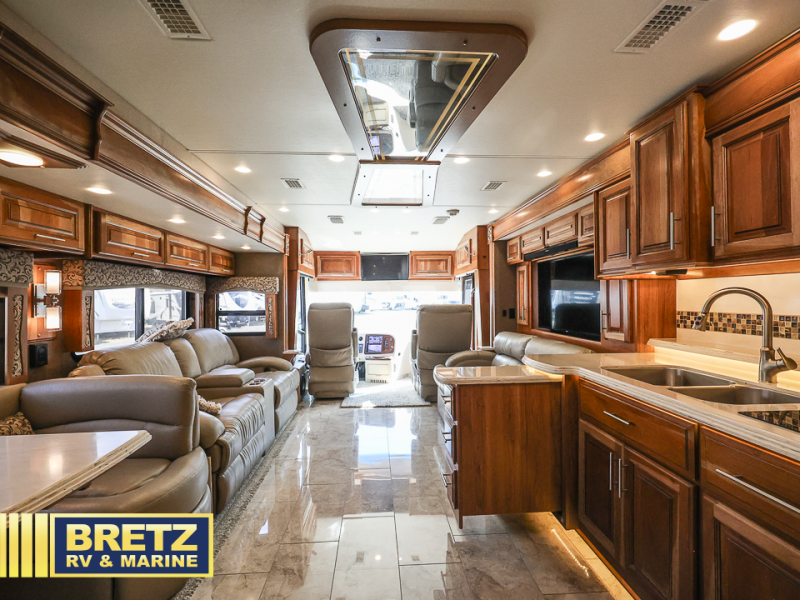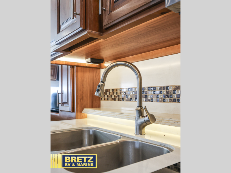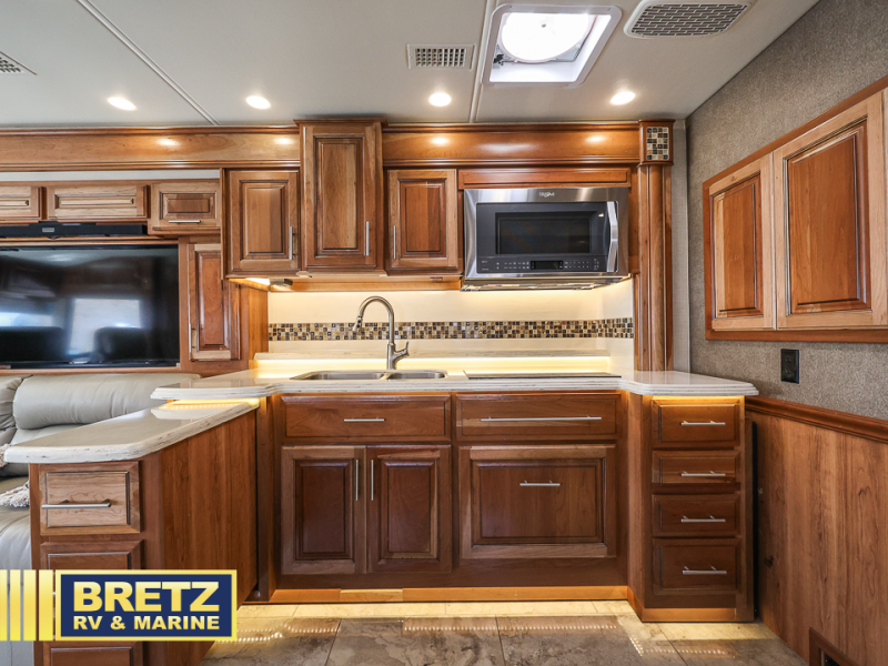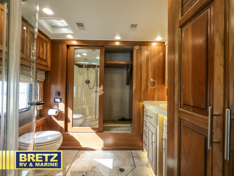 As you enter the passenger side of the motor coach to your left there is a slide out featuring a hide-a-bed sofa with a 50" TV with lift. The slide also includes a double kitchen sink, two burner range, microwave, shelf, and overhead cabinets for your dishes and things. On the opposite side you will see a sofa with two ottomans, a dinette with two chairs, refrigerator, and a pantry inside the second slide in this area. You can choose a booth dinette option and a theater seat option with two power recliners if you like. A 32" TV is in the front of the coach for additional inside enjoyment.