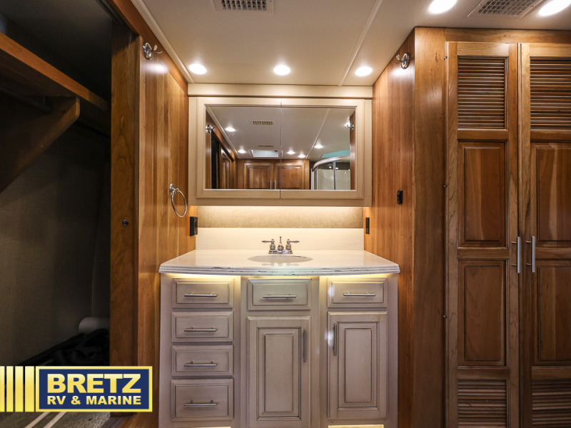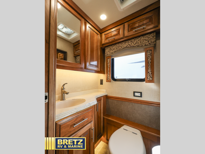 As you head towards the rear of the motor coach, the half bath is on your left which includes a toilet, and vanity with sink plus storage above.