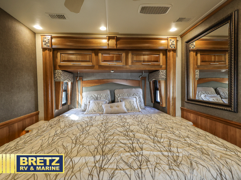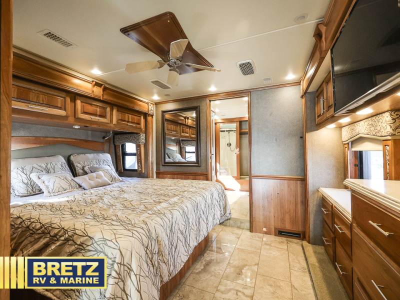 Next, the private master bedroom features a king bed slide with nightstands on either side of the bed plus overhead cabinets. Across from the bed there is a slide out vanity, dresser, overhead storage, and a 32" TV. You will walk through the bedroom to enter the full bath.