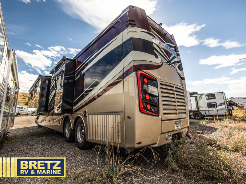 This Entegra Coach Aspire 44W class A diesel motor home features a king size bed for the owner, a rear full bath with a washer and dryer, a mid-cab half bathroom for everyone, and quad slides allowing plenty of space to entertain, plus more!