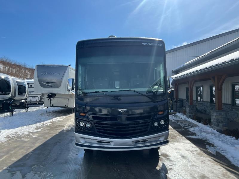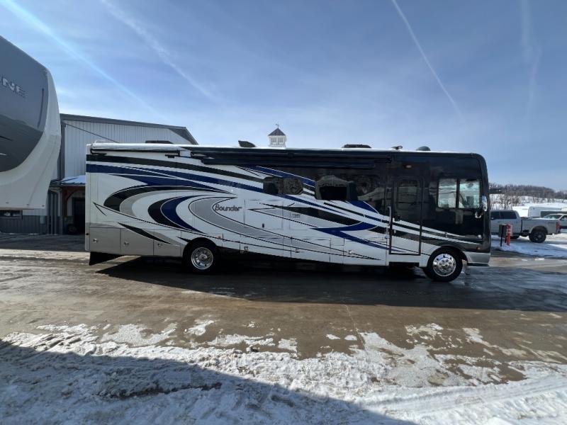 Traveling across the country is super easy in this Bounder class A gasoline motorhome by Fleetwood RV. You will love the change of scenery out the large pictures windows as you make your way from one place to another. With the quad slides fully extended this already 102" wide body design will feel super spacious throughout. There is a 42" x 72" facing dinette for dining and a large sofa slide opposite with three sets of seatbelts for your rear travelers. A full kitchen with stainless steel appliances make it easy to whip up light meals and snacks between outdoor adventures and attractions. At night, you will be pleasantly surprised with a comfortable king Euro Top mattress for a great night's rest, along with a full bath including a large shower with seat, and double entry doors into the bath for added convenience, plus so much more!