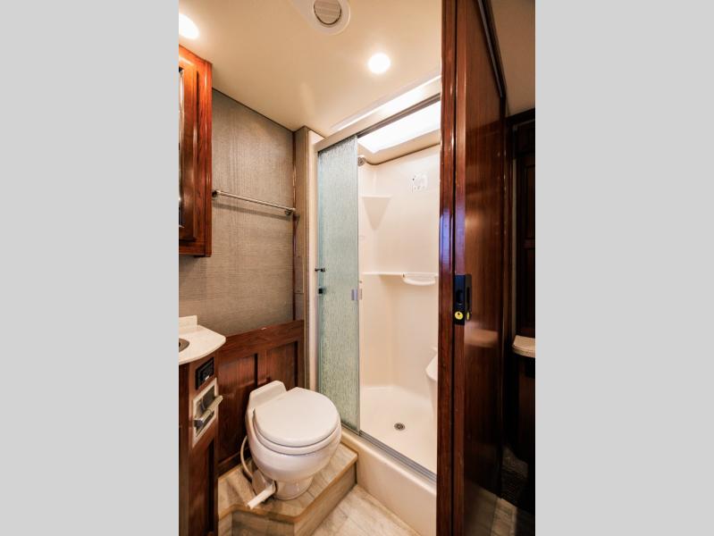 The very back of this Bounder model features a large shower, a toilet, and an L-shaped vanity with sink, plus overhead linen storage, and more.