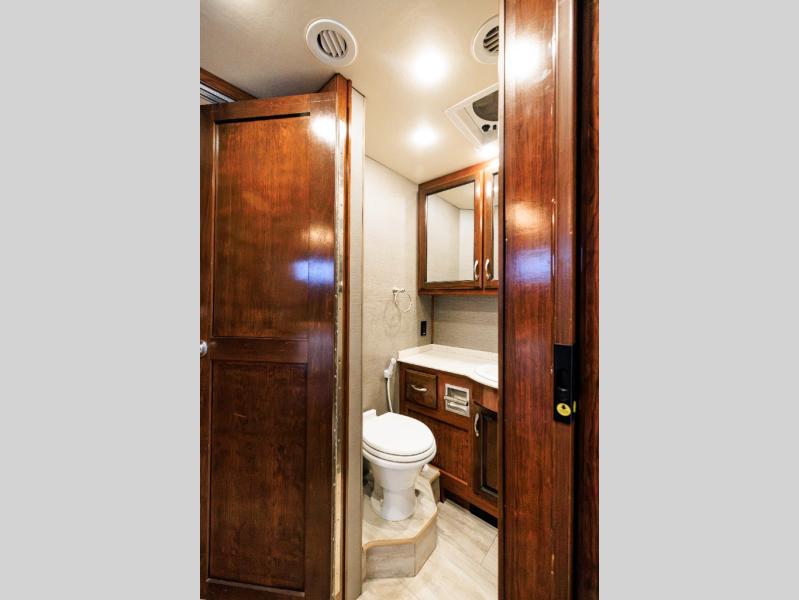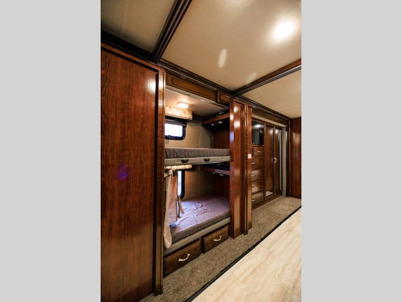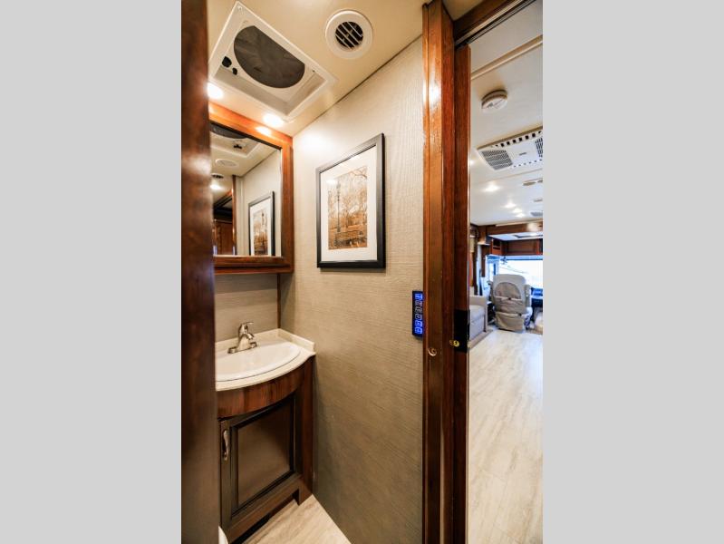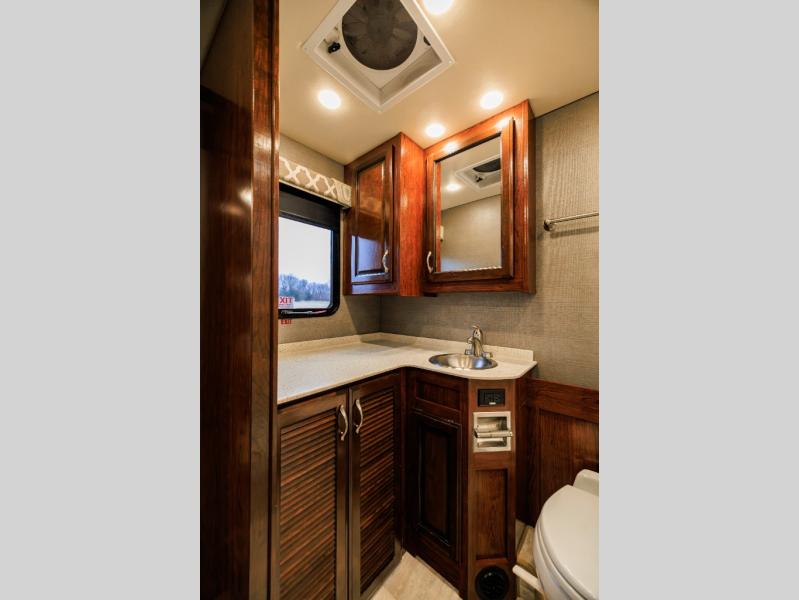 Mid-coach find a half bath along the road side that features a toilet, and large vanity with sink, plus overhead medicine cabinet. It is conveniently located across from a set of bunks for the kids featured within the curb side slide out. The bunks are 28" x 73" and each have their own flat screen monitor to enjoy.