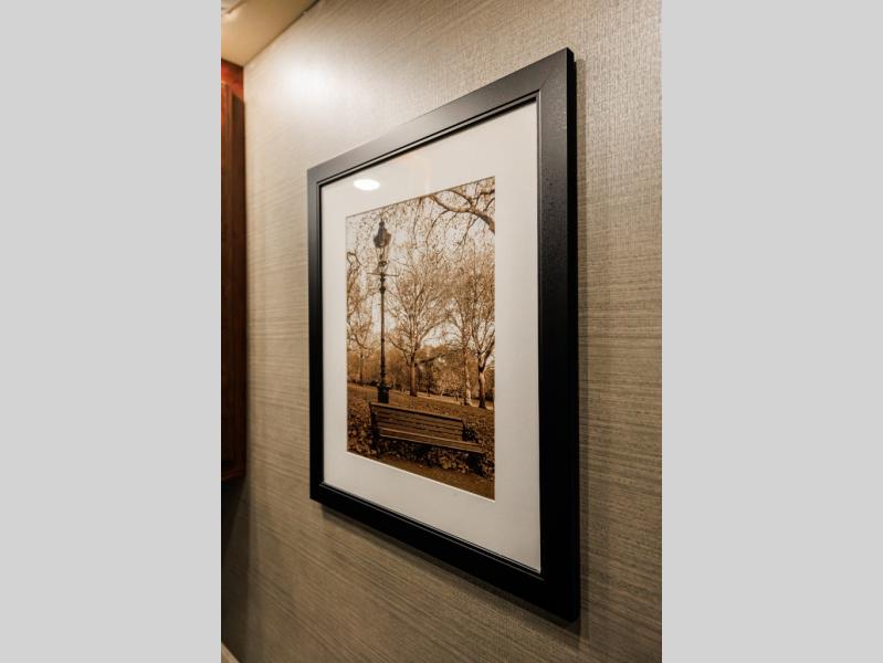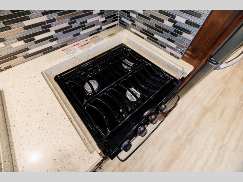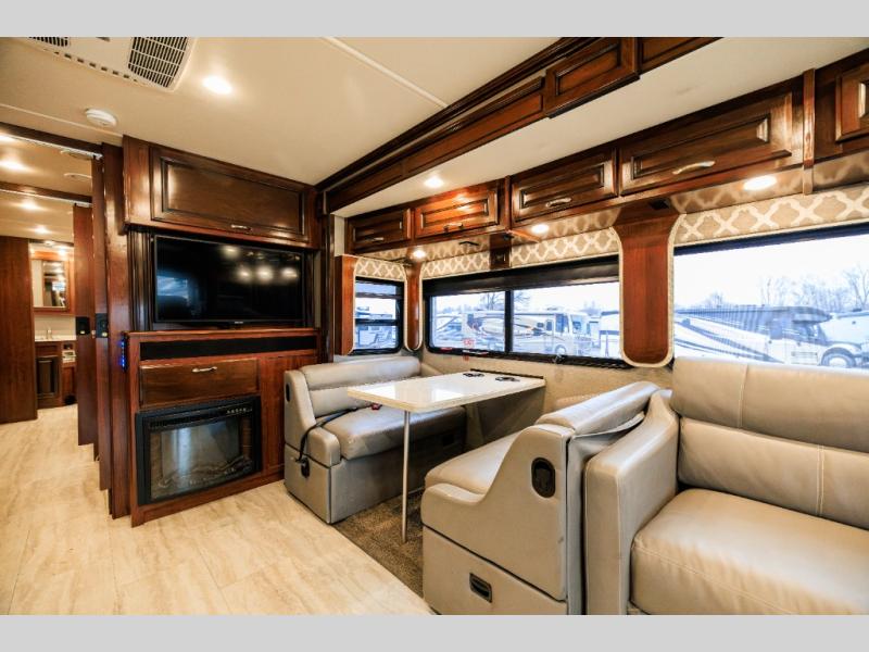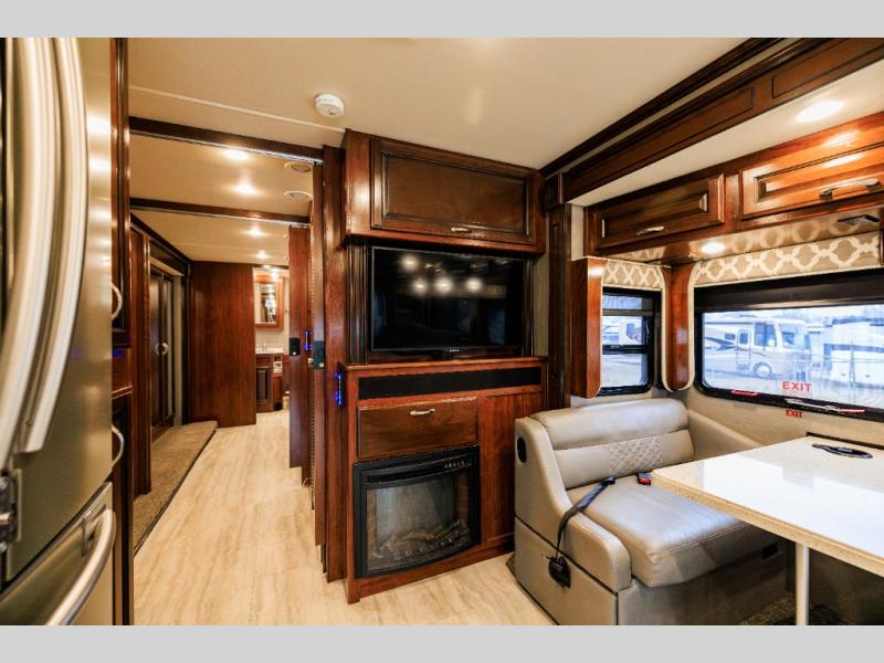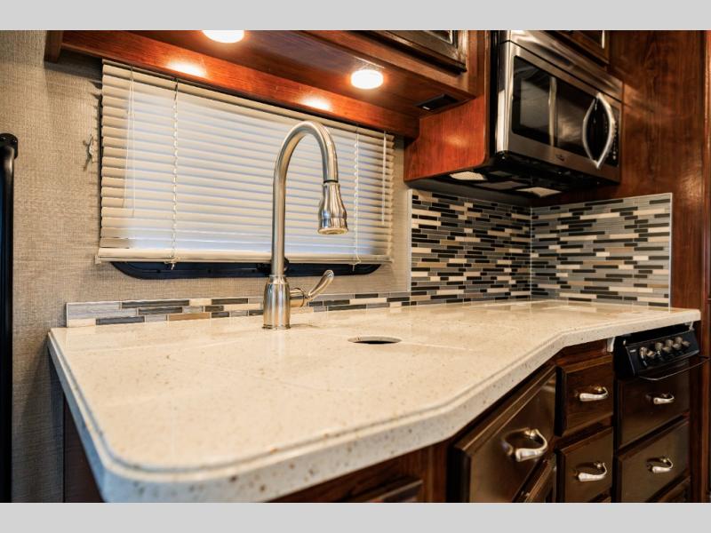 Along the opposite side of this model there is a slide out sofa sleeper and booth dinette for seating that includes seven sets of seat belts! No back seat traveler should feel unsafe! The sofa can easily convert to extra sleeping space when needed, and from either you can enjoy the 40" LED TV and fireplace that faces the front of the motorhome.