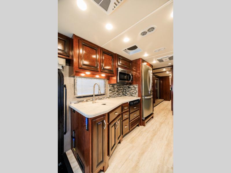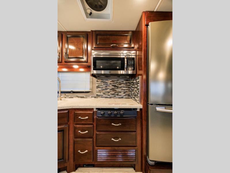 Step inside and check this rig out. The front features a kitchen to the left of the entry door where you will easily be able to create all of your favorite meals, and the residential refrigerator makes it easy to stock up on things so you don't have to keep running to a store. There is a three burner range with overhead microwave oven, plus plenty of storage in a pantry and overhead cabinets as well.