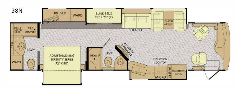 For your next trip across the country you will want this beauty! This Fleetwood Discovery 38N class A motor home is the first in it's class to offer an Aqua-hot instant tankless water heater and a tile shower! You will enjoy all of the interior space with the triple slide outs and along the roadside there is a full wall slide out! In the evening plan to relax with your family and watch a little TV at the 43" LED TV in the living room, and if you want you can even have a fire in the fireplace! this model also features two full bathrooms! and in the rear you will find the master bathroom with a tile shower with seat, sink, wardrobe, and toilet. After a day of traveling then come get a good night's rest on the king adjustable Serenity Series bed and more! This model is available with an optional 360hp.