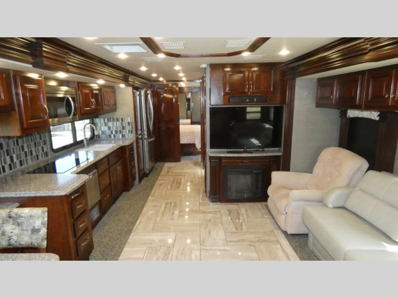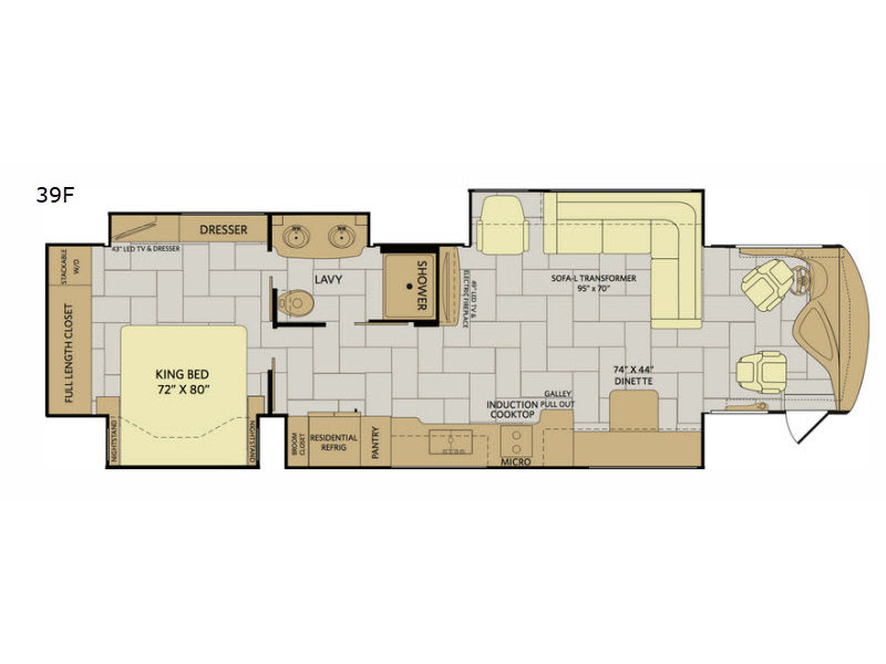 For your next cross-country road trip you will want this beautiful Discovery 39F class A motor home. When you are ready to relax then come sit and enjoy the comfortable 95" x 70" L-transformer sofa or lounge chair. Along the interior wall there is a 49" LED TV plus an electric fireplace. Throughout this model there is plenty of room with the quad slide outs, and in the rear bedroom you will find a king bed, a full length closet, and a stackable washer/dryer so you can easily keep up with your laundry while you are away from home and more!