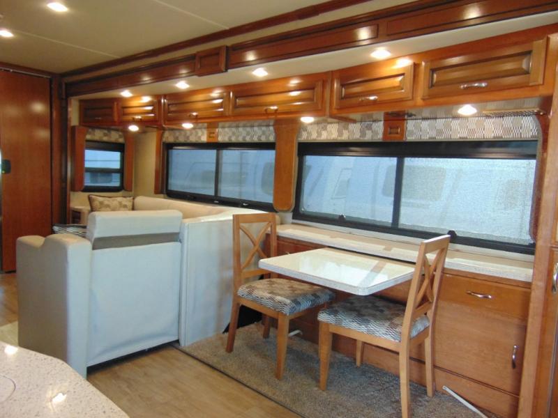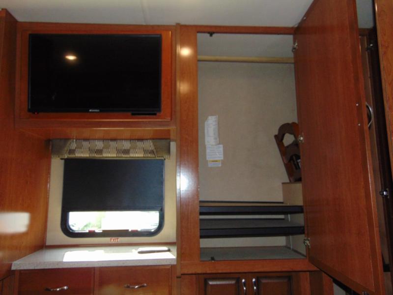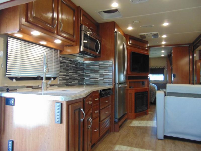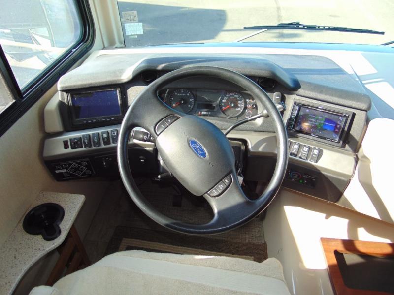 Let this double slide out Southwind 34C take you and your family to the destination of your choice! There are plenty of comforts throughout this motor home, so sit back, relax, and enjoy your time away from home. Come enjoy your morning cup of coffee at the pedestal table which is located between the driver and passenger seat. Within the slide out along the roadside there is a 42" x 72" facing dinette and an L-sofa. Across from the sofa, along the outside wall of the bathroom there is a 40" LED TV and an electric fireplace which is great for those chilly evenings!