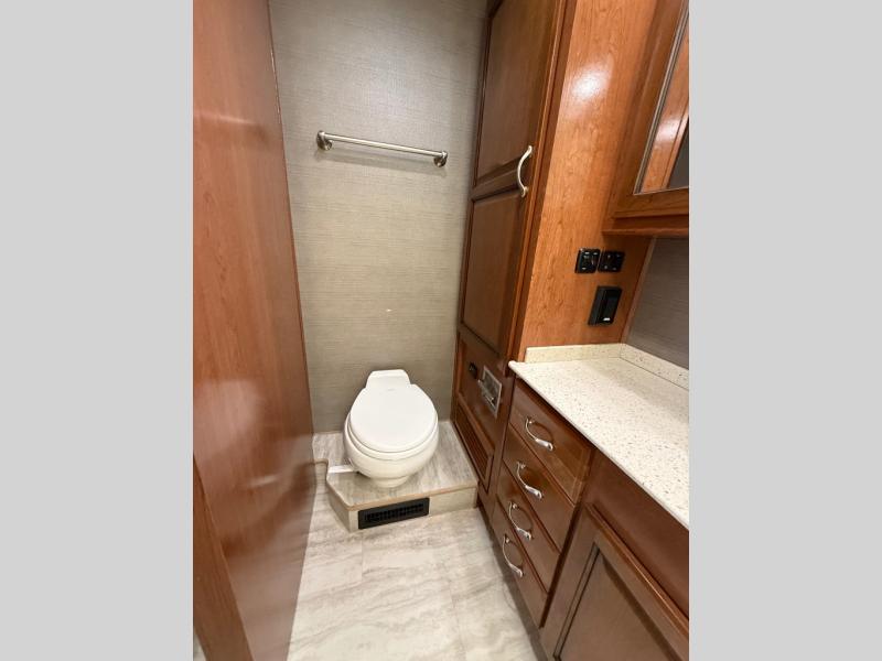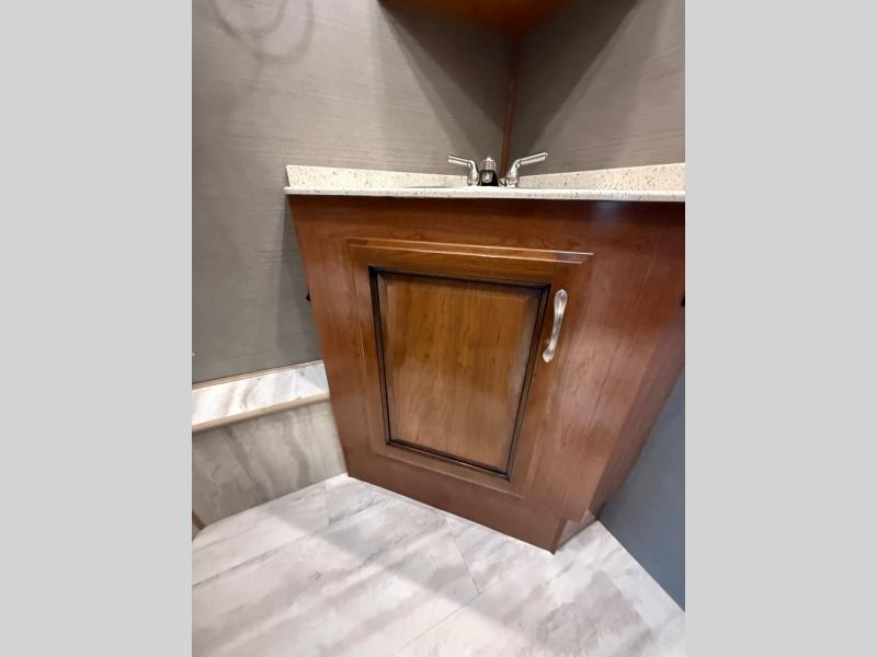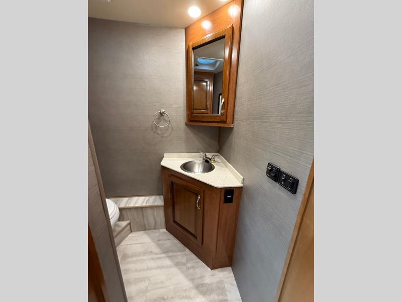 Mid-coach enjoy the convenience of a half bath including a toilet and corner vanity with sink. There is also overhead storage above both the sink and toilet for your bath products.
