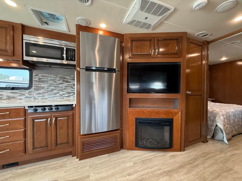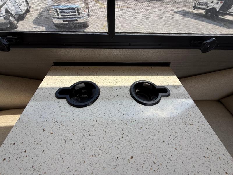 Enter and notice the large driver side slide out including a 42" x 76" booth dinette and 82" L-sofa with overhead storage. You can easily kick back and view the 39" LED TV and fireplace opposite along the angled half bath wall. If needed, both can be made into added sleeping space for overnight guests as well.