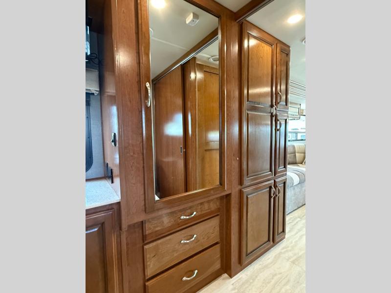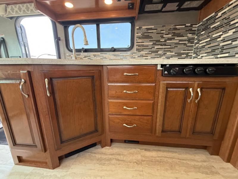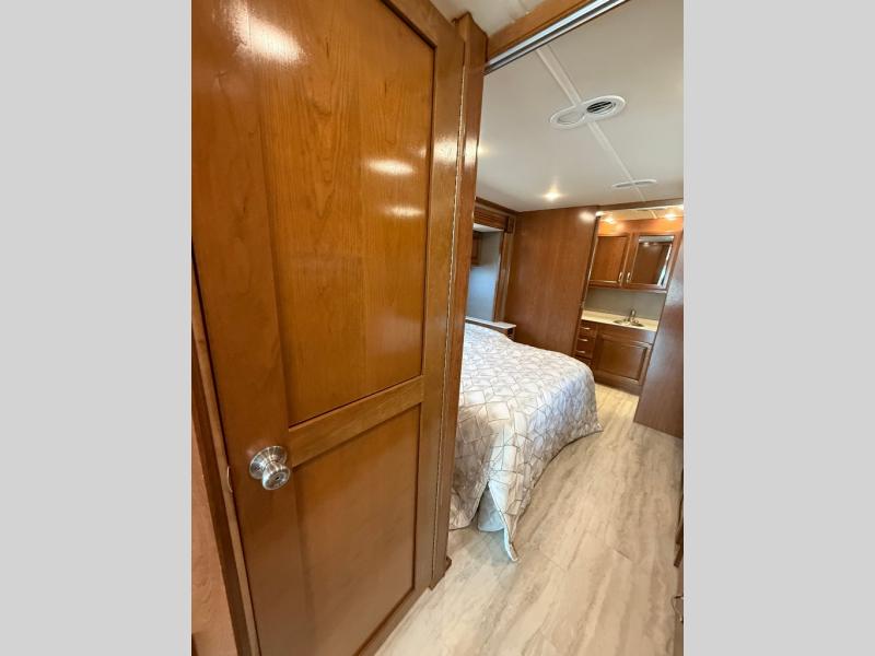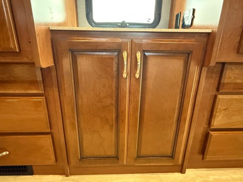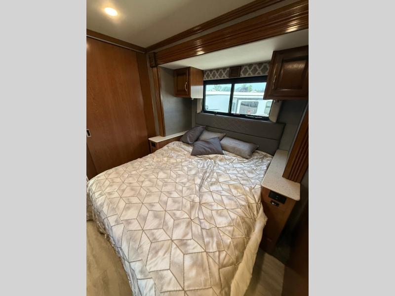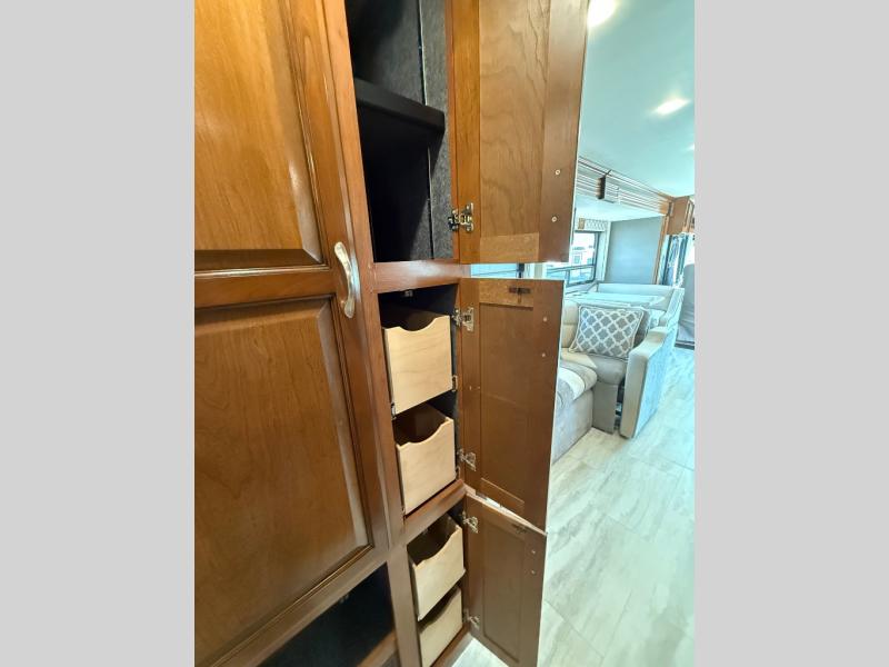 Next, a sliding pocket door leads you into the master bedroom and en suite bath. The bedroom features a slide out queen size bed with nightstands on both sides, plus overhead storage as well. Opposite the bed along the road side find a dresser with a 19" LED TV above, and dual wardrobes for clothing storage. Another sliding door leads into the rear master bath which includes a large shower, toilet, vanity with sink, plus storage, and so much more!