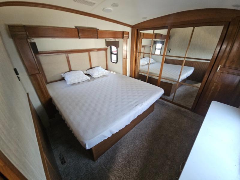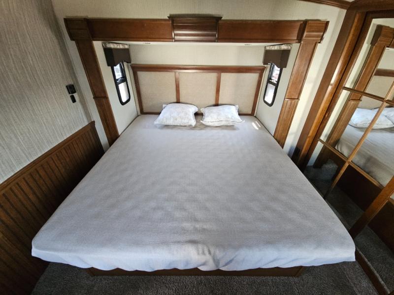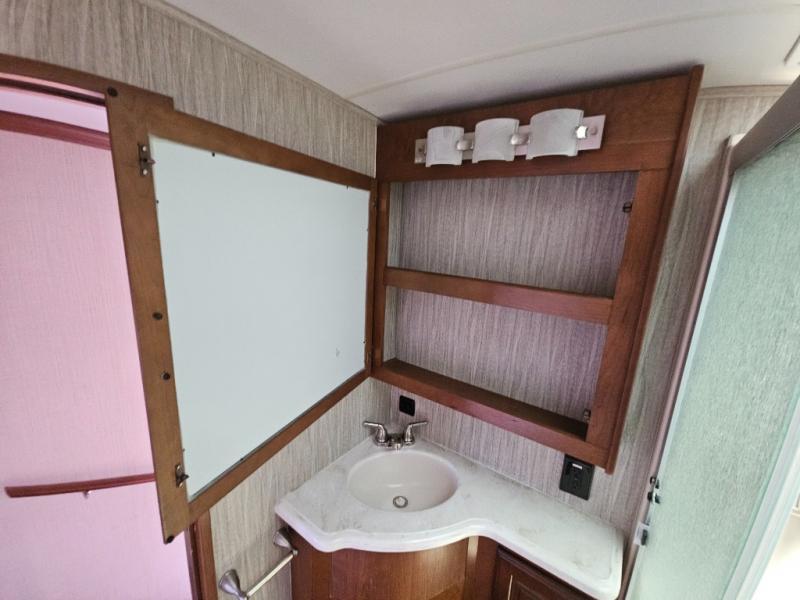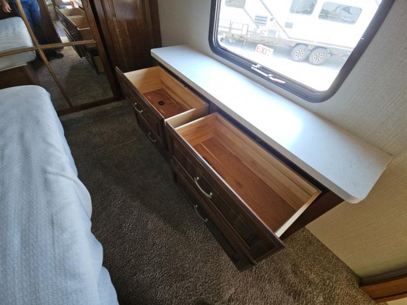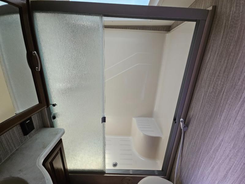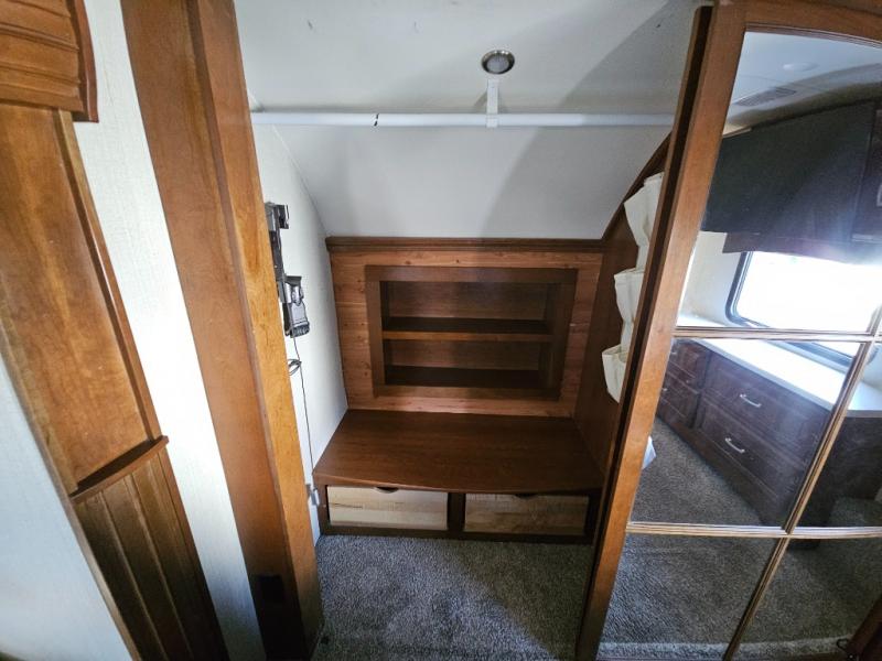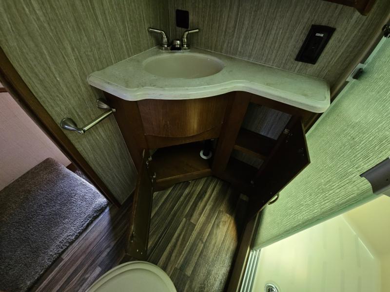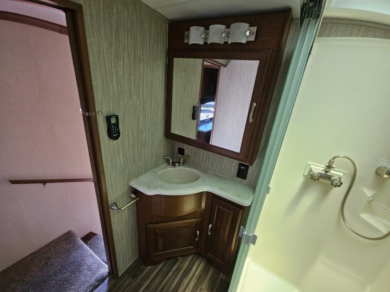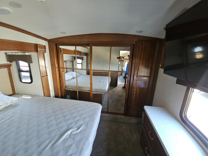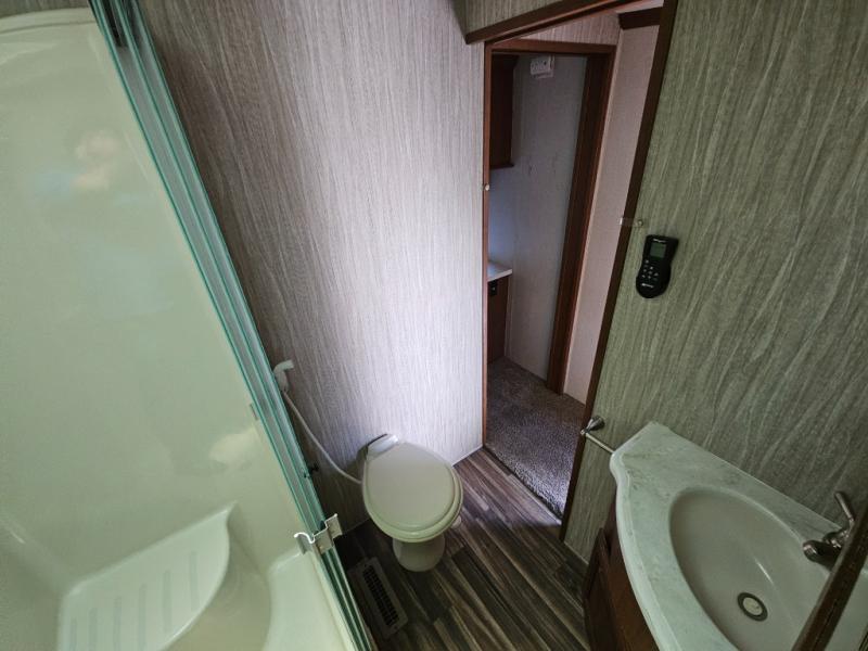 Step inside and head to the right up a couple of steps to a complete bath and front master bedroom. The bath offers a shower, toilet, and vanity with sink, plus overhead cabinets for storage. A sliding door just outside the bathroom leads into the front master where you will enjoy a spacious retreat with a king bed slide out, or optional queen which will provide a bit more walking around space and room in the slide for a nightstand. There is also a dresser opposite the bed with a 32" TV above, and a front wall wardrobe with closet that has been prepped for a washer and dryer if you choose to add, along with some drawer space too.
