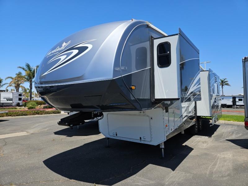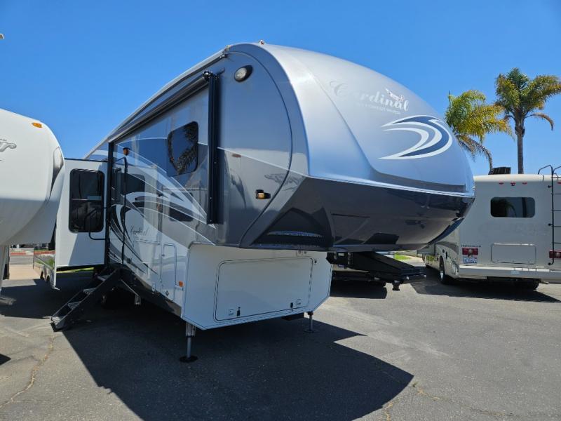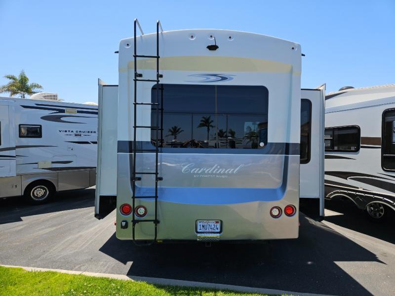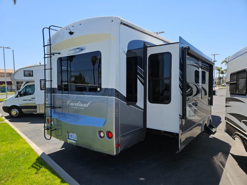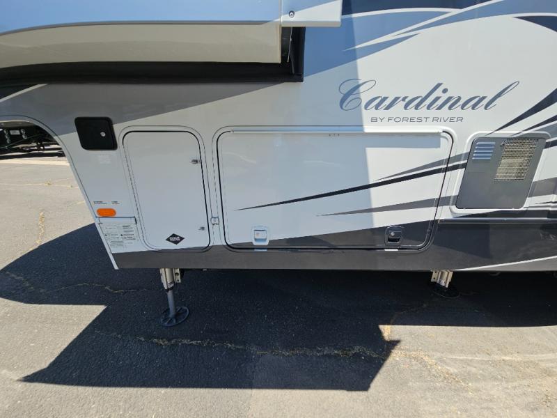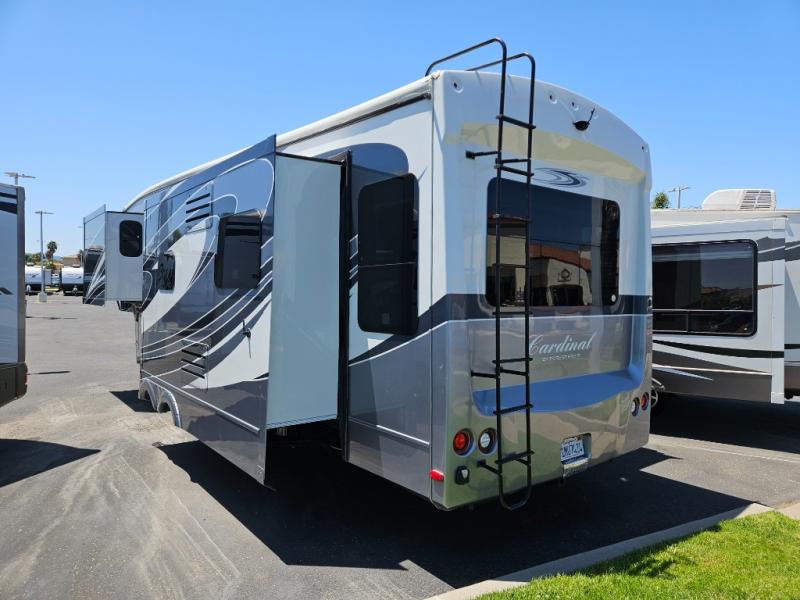 This Cardinal Fifth Wheel by Forest River features triple slide outs for plenty of space to enjoy, a rear living layout, and a front bedroom with a king size bed, and more.