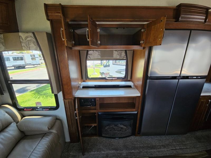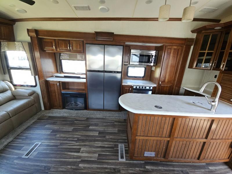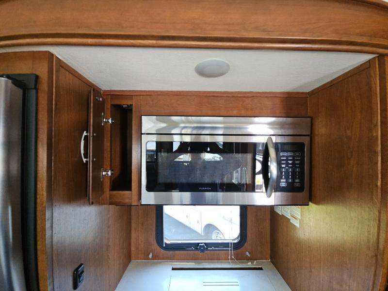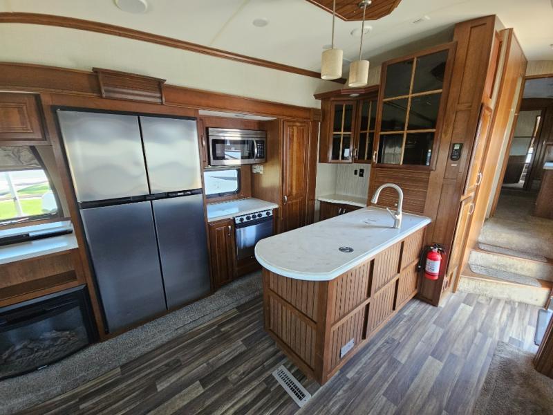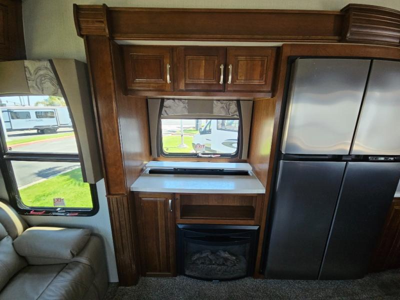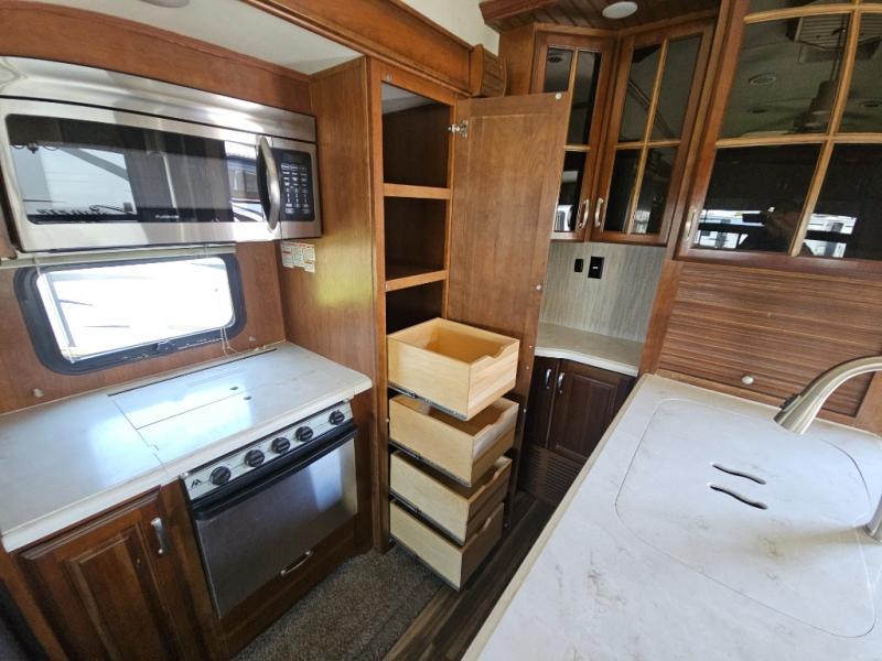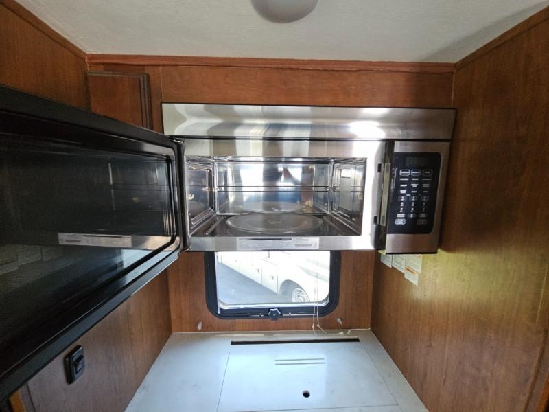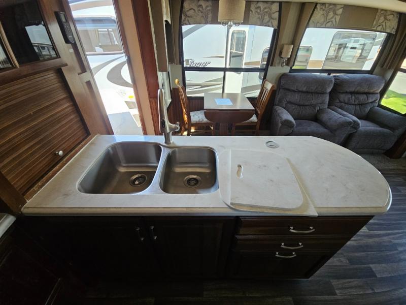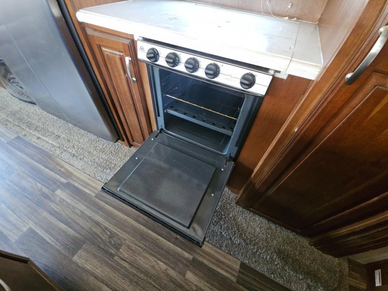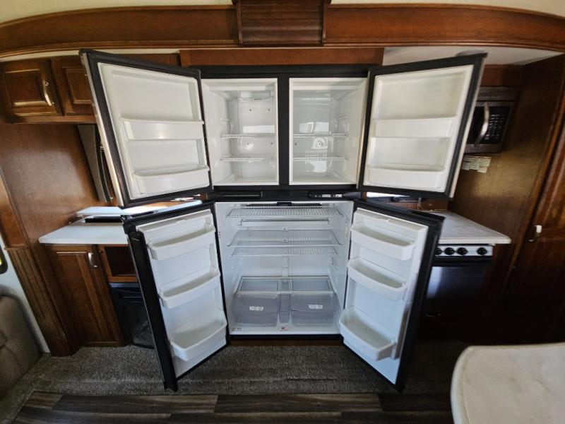 Back to the main entry door continue into the spacious combined kitchen and living area thanks to dual opposing slides. There is a slide out featuring a free standing dinette and theater seating, or you may choose two recliners here instead. Along the rear wall you will find more seating with a 90" hide-a-bed sofa. Adjacent to the sofa there is a slide out featuring an entertainment center, and the kitchen appliances. You will easily be able to cook for your family and friends with the amenities provided. Along the slide you will find a stainless steel three door refrigerator, a three burner range with an overhead microwave oven, and a pantry. There is also a counter peninsula coming out from the interior wall that features a double sink, and more storage space for your dishes and pots and pans.