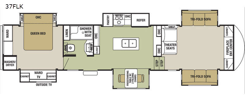 Space, space, and more space can be found throughout this 37FLK Cedar Creek Silverback fifth wheel by Forest River. With six slide outs there is plenty of room to move around plus there is even room to entertain a few guests. The front living area is sure to draw a crowd with the front entertainment center and fireplace. In the kitchen there is an island with a double sink and all of the amenities that you would expect to find at home such as a refrigerator, three burner range, and plenty of counter space for meal prep. The washer and dryer in the rear bedroom make it easy to keep up with the laundry while you are away. You can move your party outdoors since there is an outside TV. Just grab a snack and pull up a chair for an outdoor movie night!