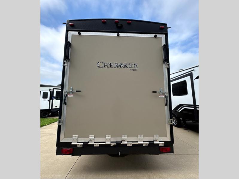Get ready to let the fun continue all weekend long with this Cherokee toy hauler fifth wheel 255RR! While you travel there is plenty of room for a few dirt bikes, a four wheeler, or an ATV with 167" of cargo space along the curbside. After you reach your destination and unload your off-road toys then set up the flip-up sofas for a nice area to sit and visit or use this area to enjoy your meals. The walk-in pantry is spacious enough to store all of your dry or canned goods. At night mom and dad can retreat to the private front bedroom where you will find a queen bed.