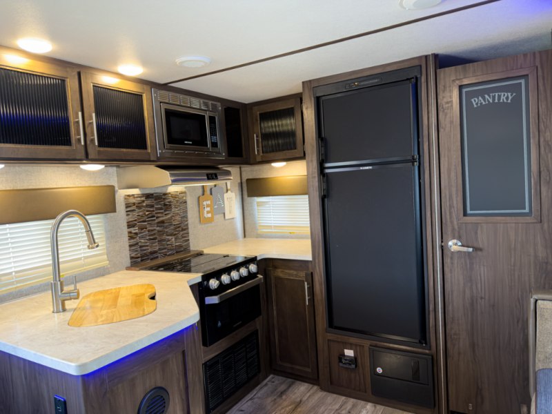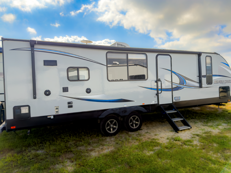 A: The 2018 Alpha Wolf 27RK-L delivers an open-concept design with a rear kitchen, roomy slide-out, and a private front bedroom. Built for comfort and function, this as-is unit offers premium features at a value price.