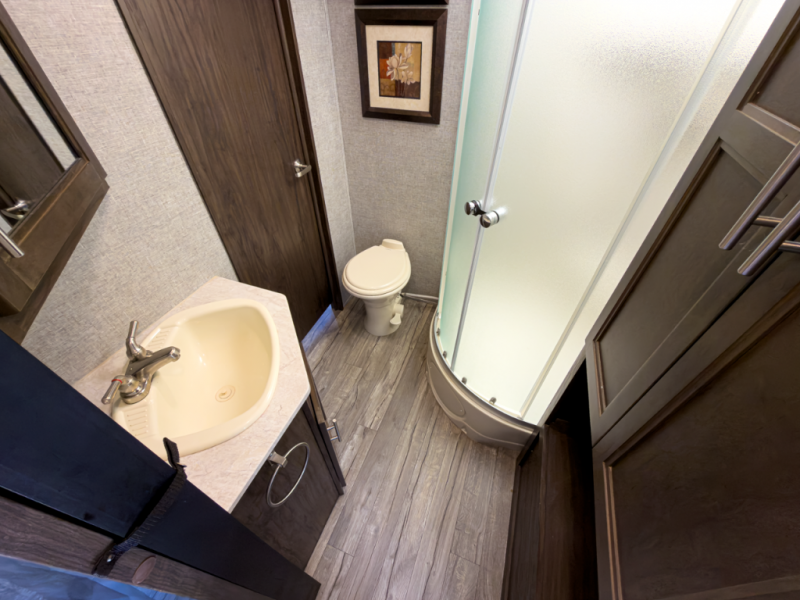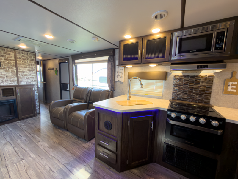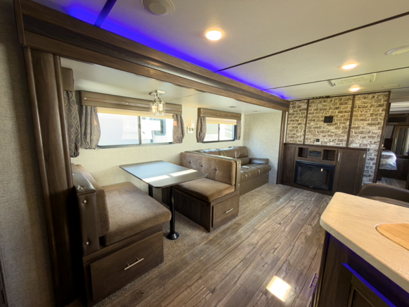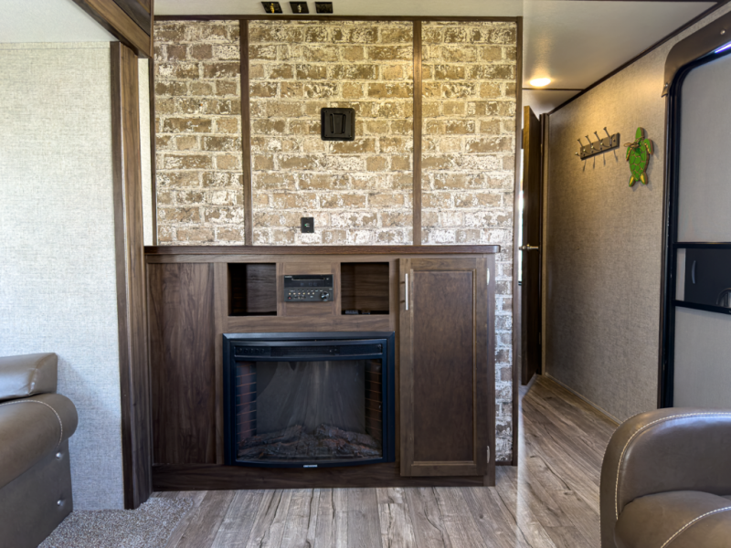 - Living Features: Entertainment center, electric fireplace, LED lighting, power awning, exterior storage