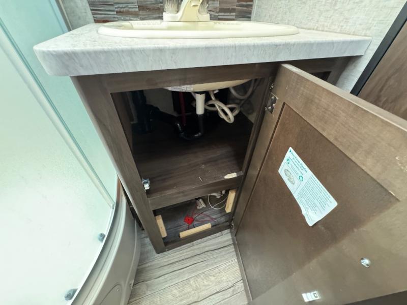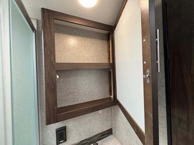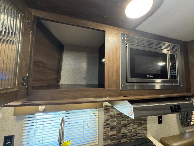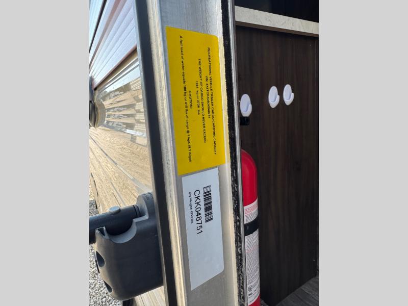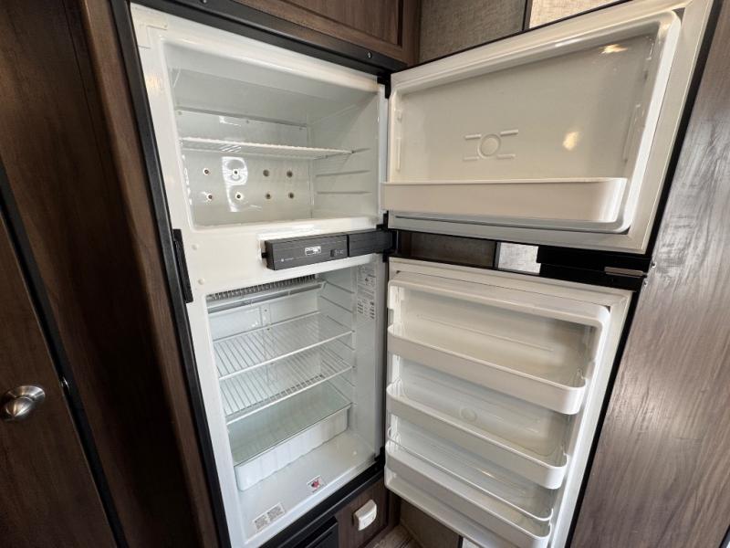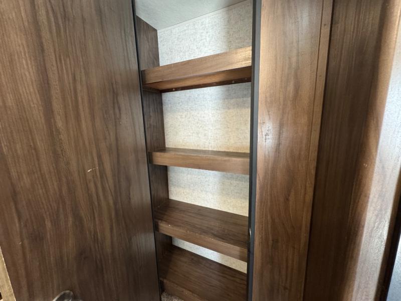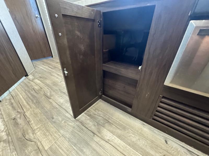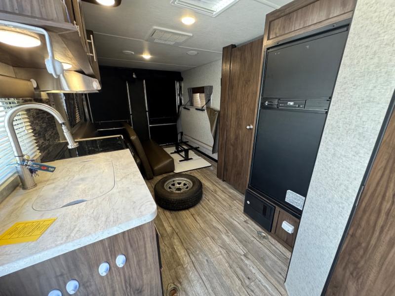 You will love the 90" x 75" rear ramp door for loading and unloading your toys and gear. This Cherokee Grey Wolf offers up to 12' 11" of cargo space up the middle of the unit for transporting a couple of dirt bikes, kids toys, and more. There is also space along each side where the dual fold-down sofas are for even more gear when you are moving down the road. Set up camp easily creating a great dining area with the table between each fold-down sofa. A walk-in pantry allows you to pack all the snacks and canned goods you need for your adventure, and you will appreciate the private bedroom up front for a great night's rest along with easy access into the full bath with dual entry.