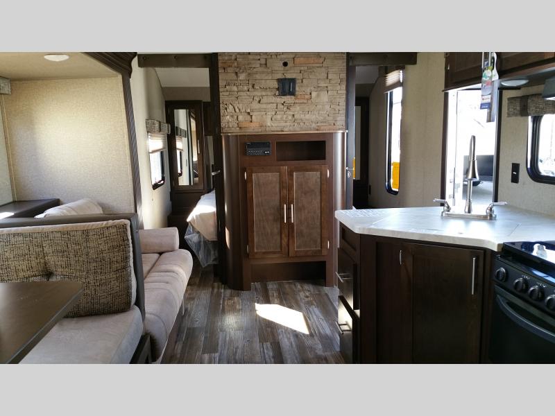 What I liked most: The entertainment center looks awesome with its storage and very nice wood finish. The bunkhouse feels like it has more storage than other models. I like the extra mirrors in the bedroom. The drawers under the dining booths are higher than other models allowing easier access.