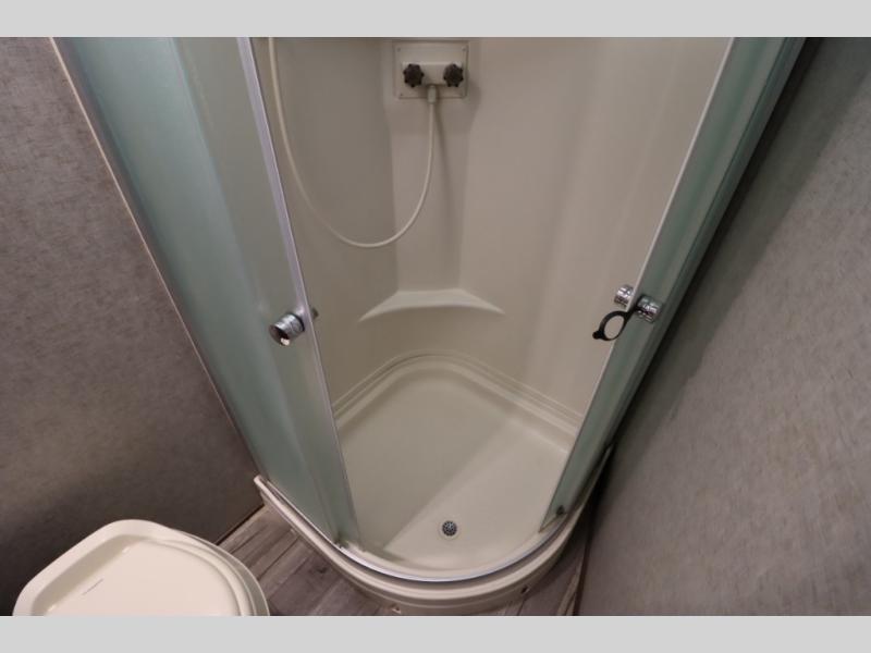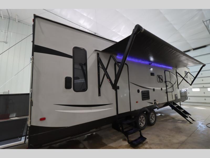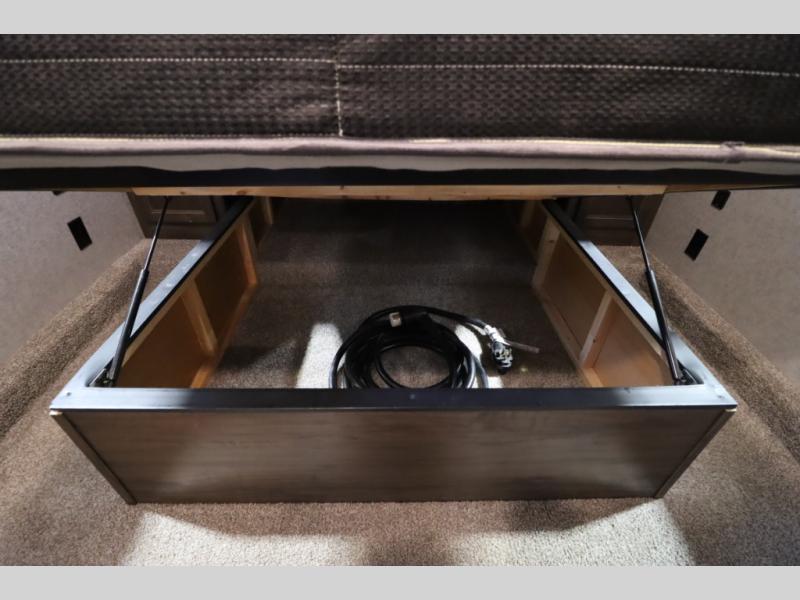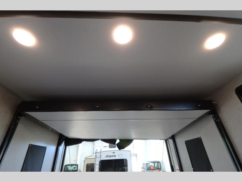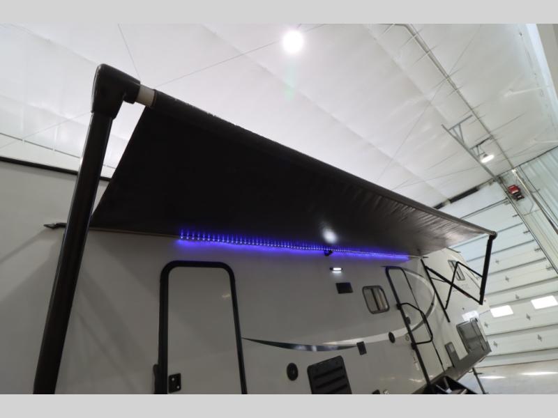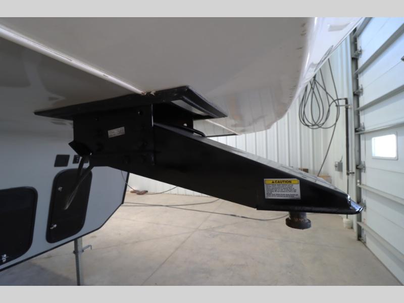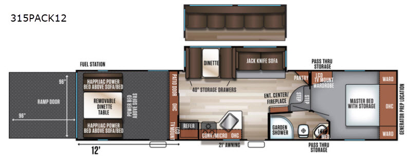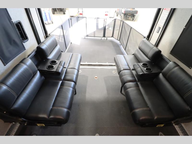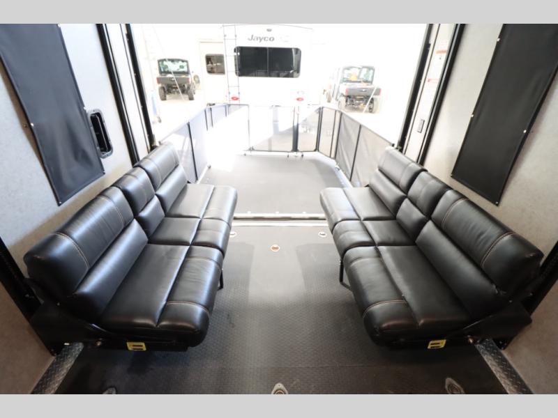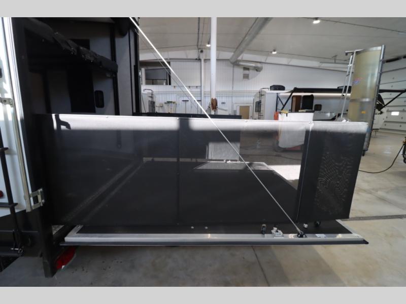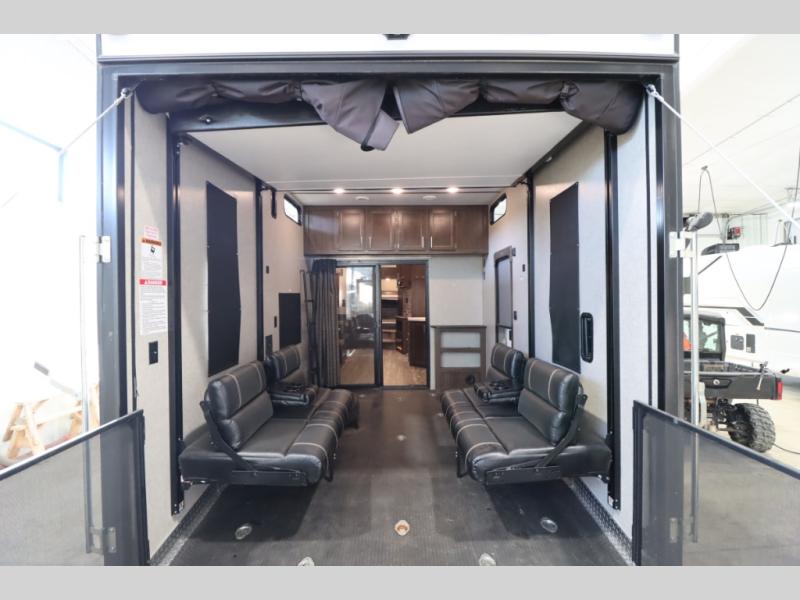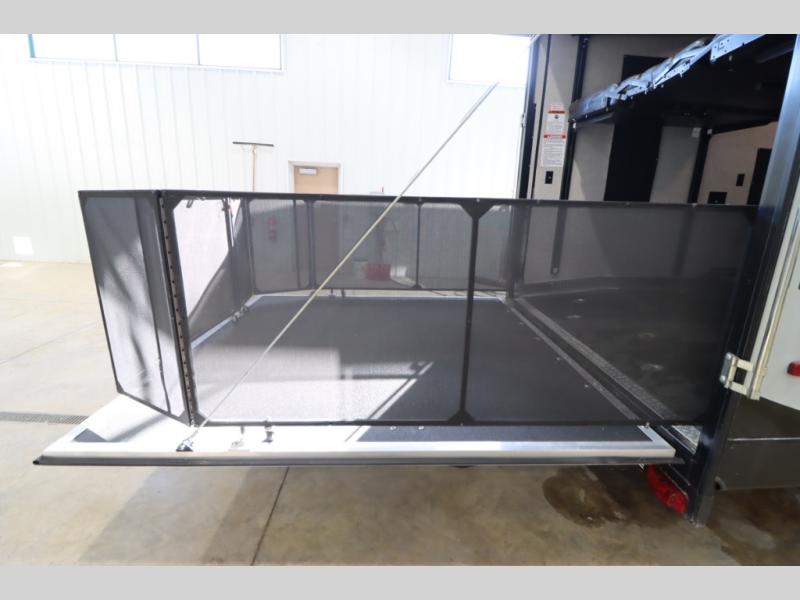 Load up your family, your off-road toys, and head out for a weekend camping trip that includes plenty of relaxing and playing outside. The cargo area has 12' of storage space as well as a side door and a Happijac power bed with two sofas below. A patio door separates the cargo space from the main living area. The front private bedroom features a queen bed with storage below plus there is easy access into the bathroom from the bedroom. Outside there is a 21' awning which offers plenty of shade and a pass through storage area for your extra camping gear and more!