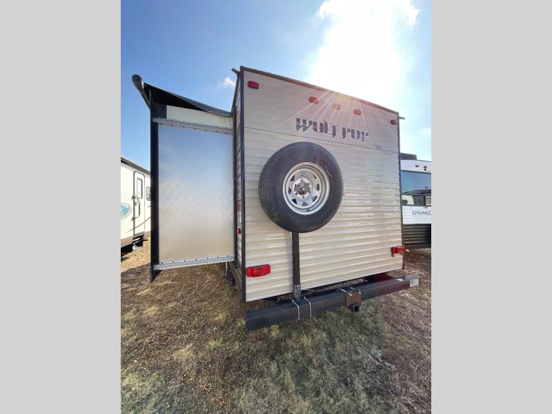 When you choose to camp with a Cherokee Wolf Pup travel trailer you are getting a lightweight trailer which is easy to tow as well as ample room throughout each model. The Limited Package offers features such as an awning with an LED light strip, high-gloss seamless countertop, an outside shower with hot and cold water, an upgraded hypoallergenic Evergreen mattress and more! The Advantage Package includes the following features an aerodynamic radius front profile, high-impact front metal, and a large exterior folding assist handle plus more! There is also the Camping Package which offers a 3.3 cu. ft. bar and grill refrigerator, a one-piece walkable decked roof, a high rise faucet, a microwave, and so much more! Come select your Wolf Pup model today!